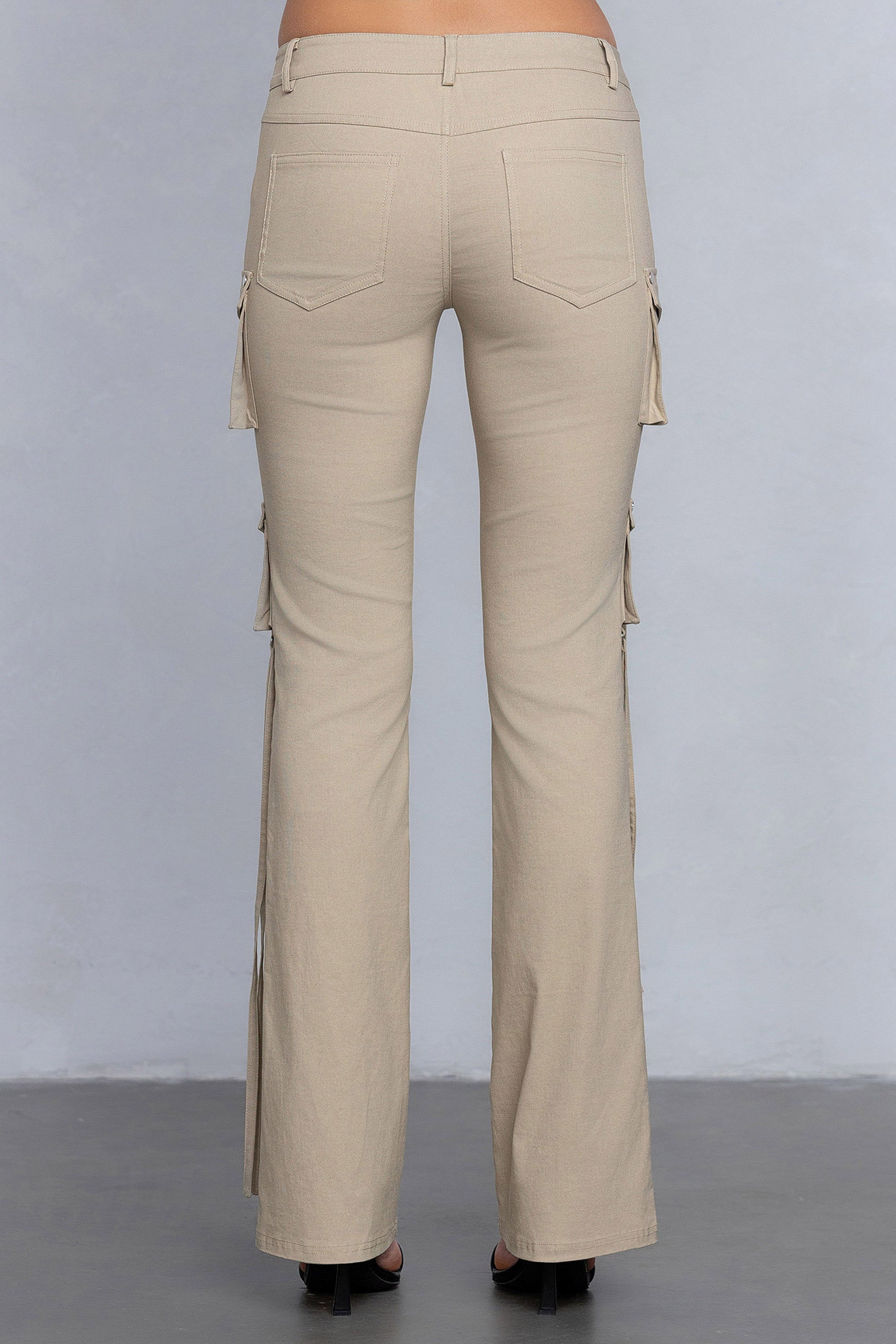 The Maven cargo pants is made from a stretchy woven material designed to have a flared bottom cut. This pants features a low rise fit, cargo pocket details, and long strap details on the sides.