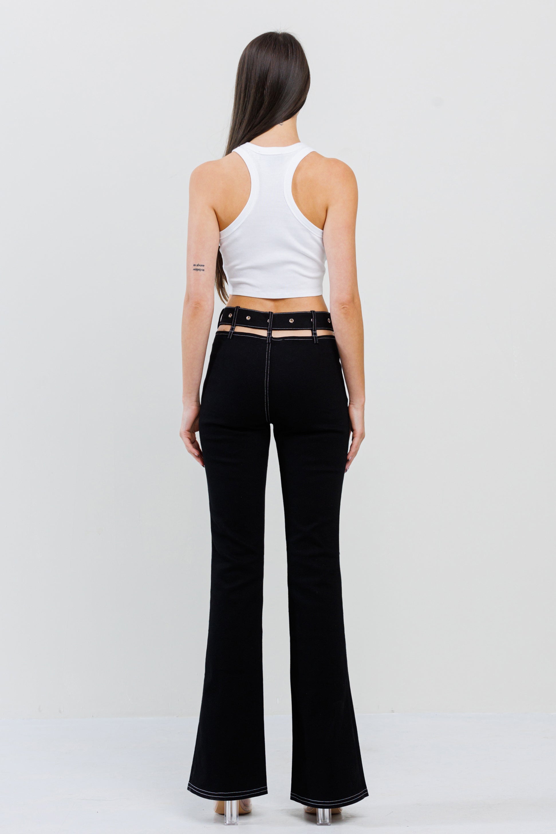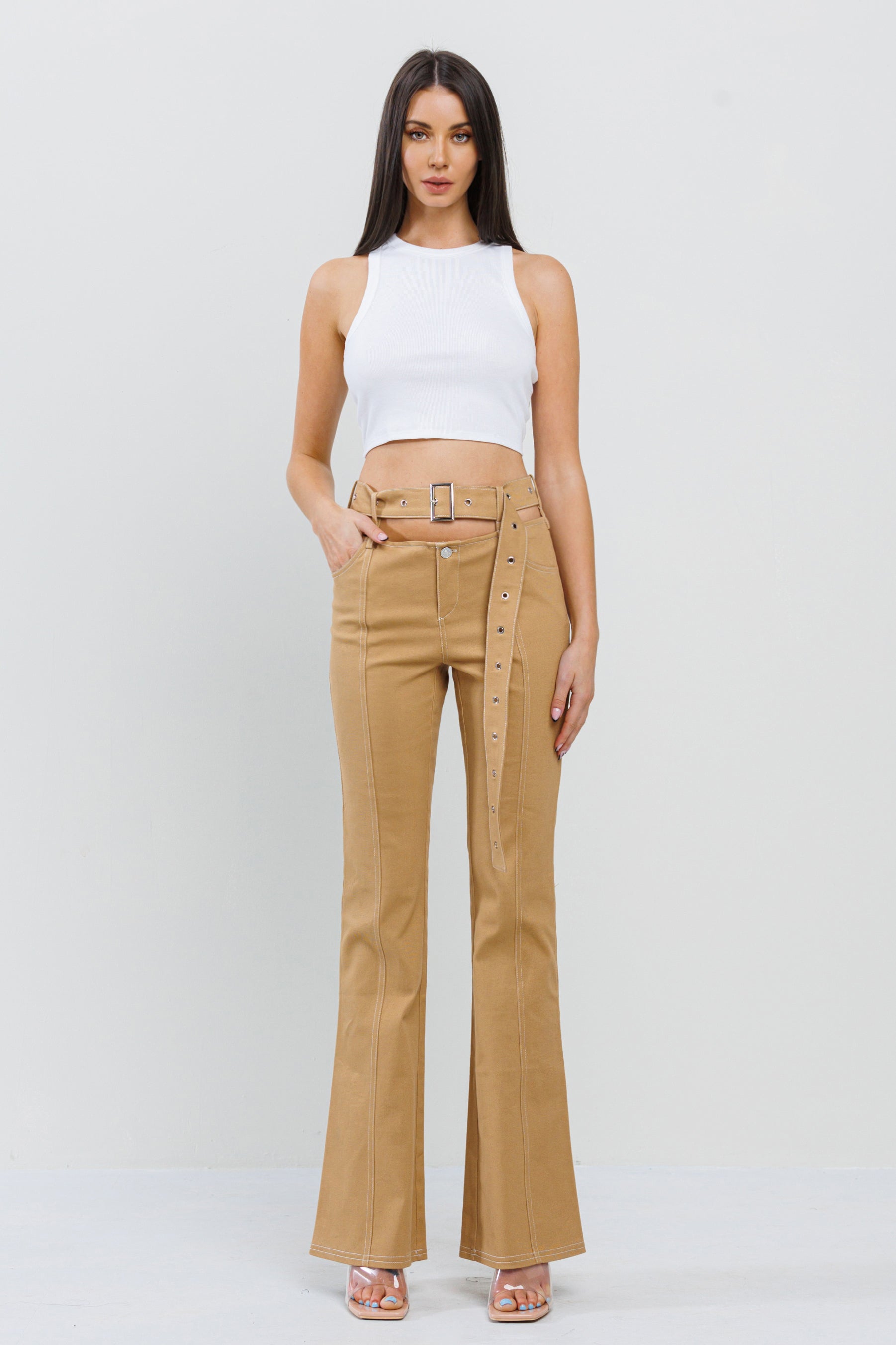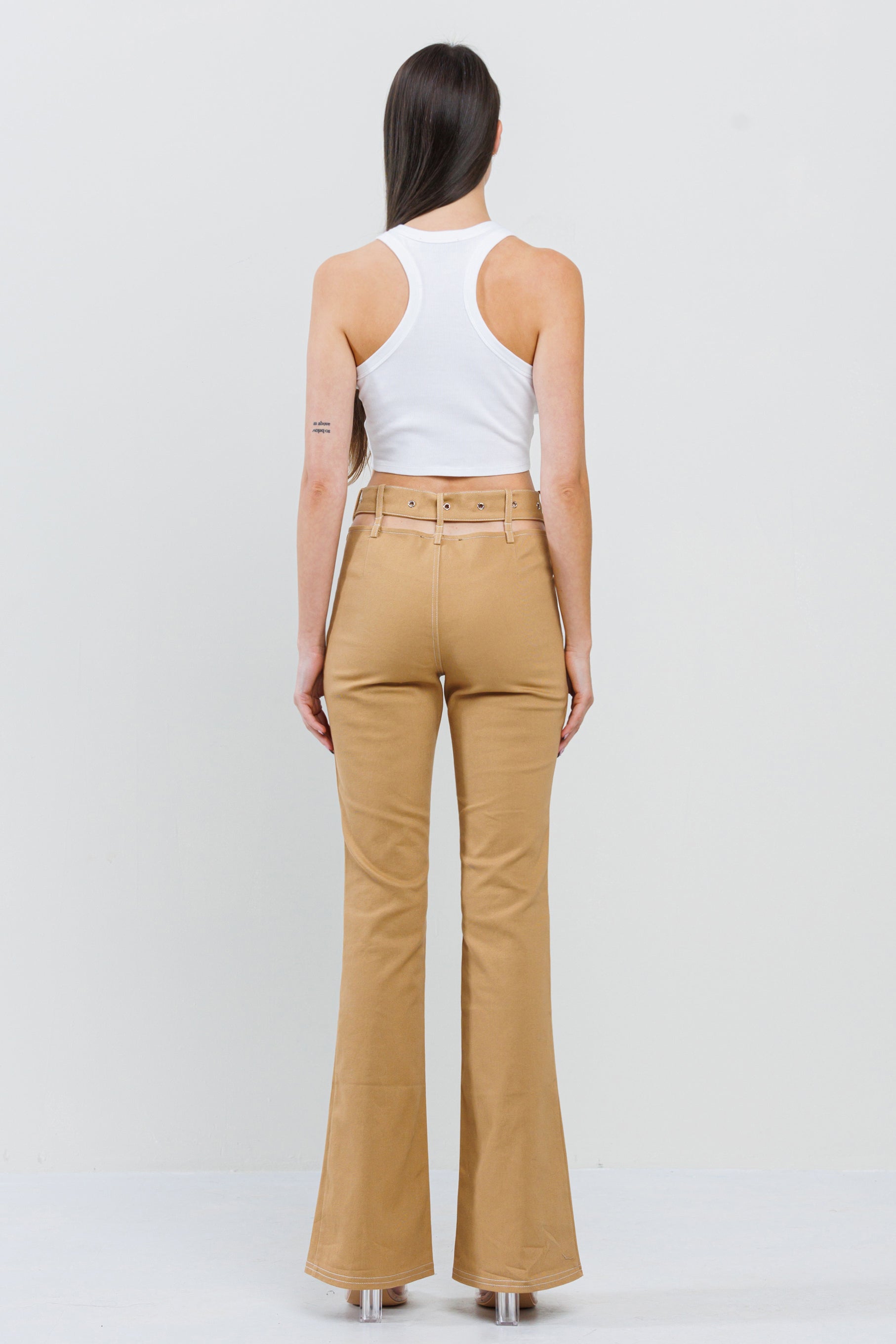 CUTOUT WAIST BELTED BELL BOTTOM PANT
