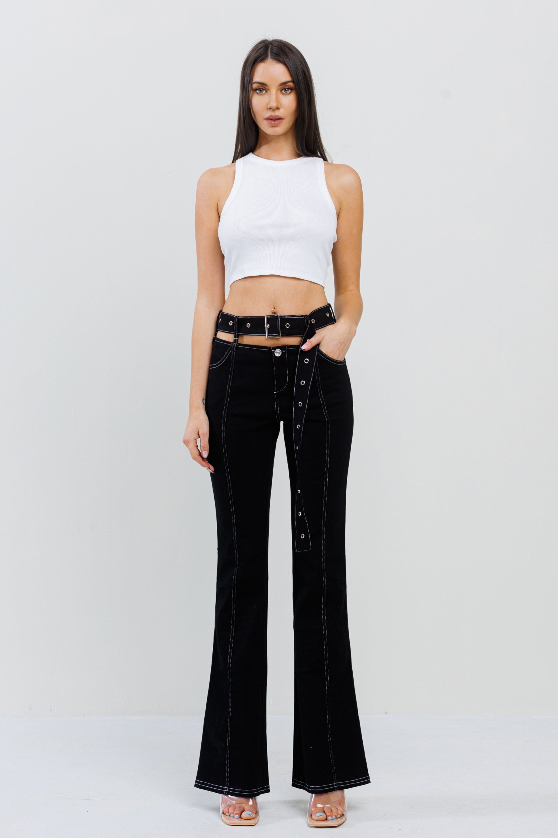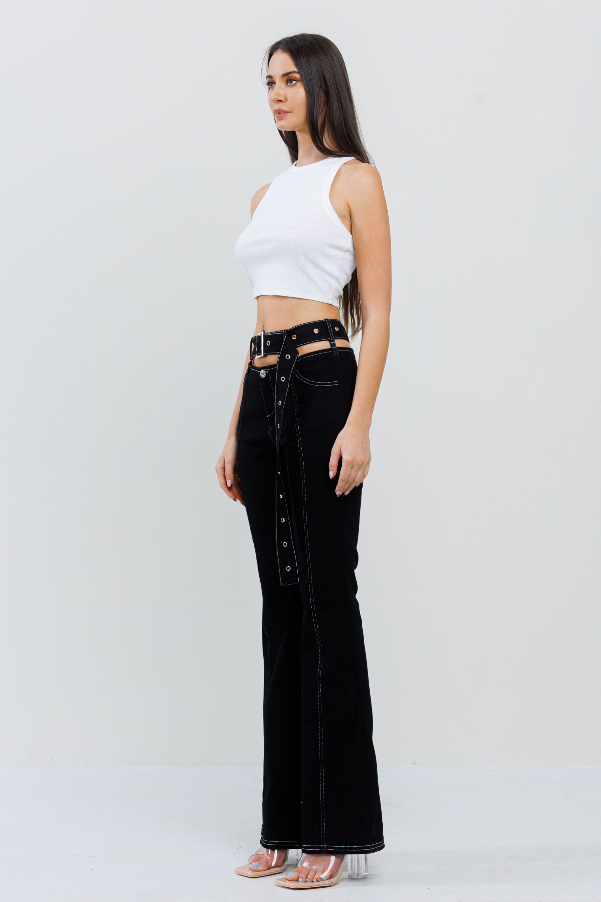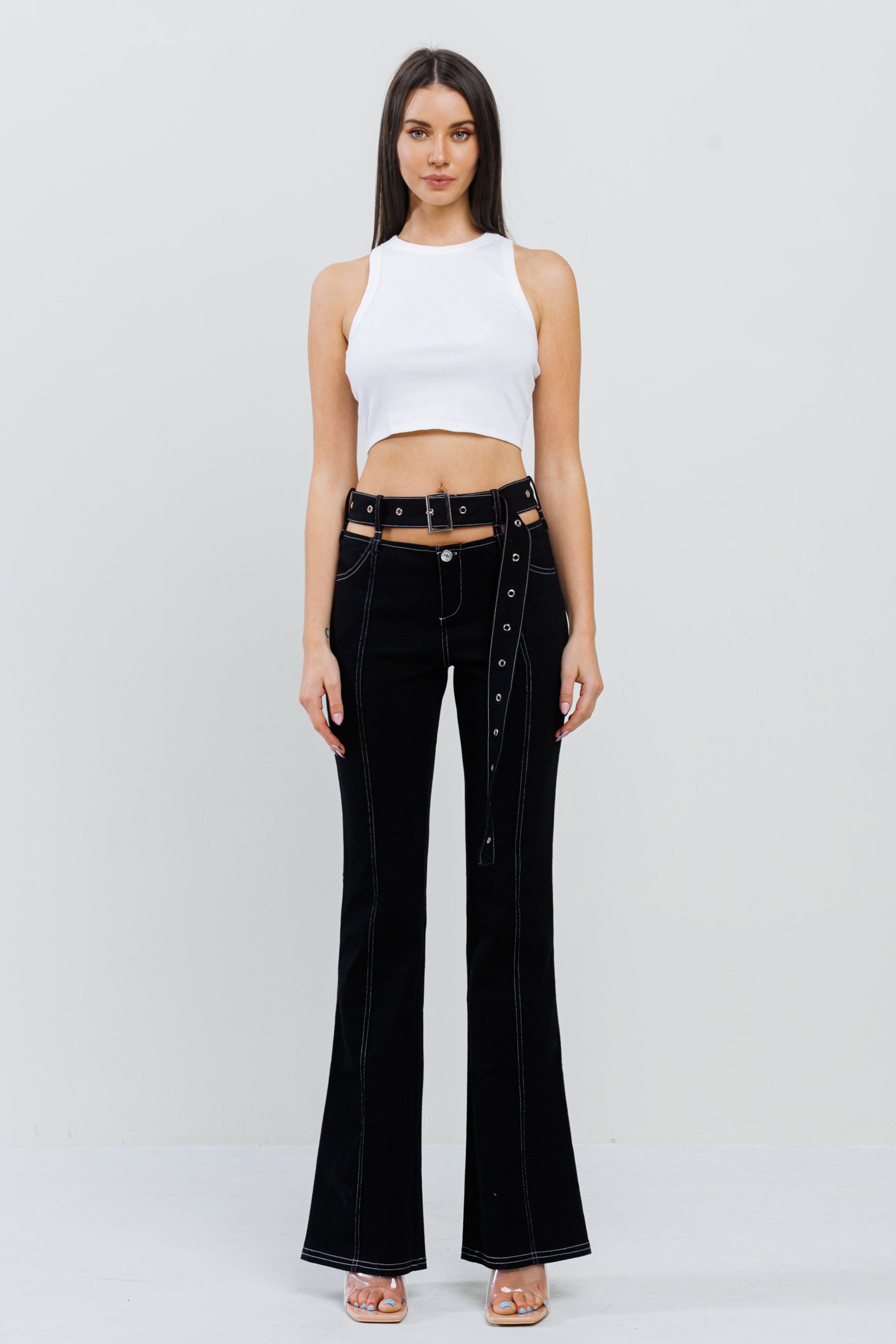 CUTOUT WAIST BELTED BELL BOTTOM PANT