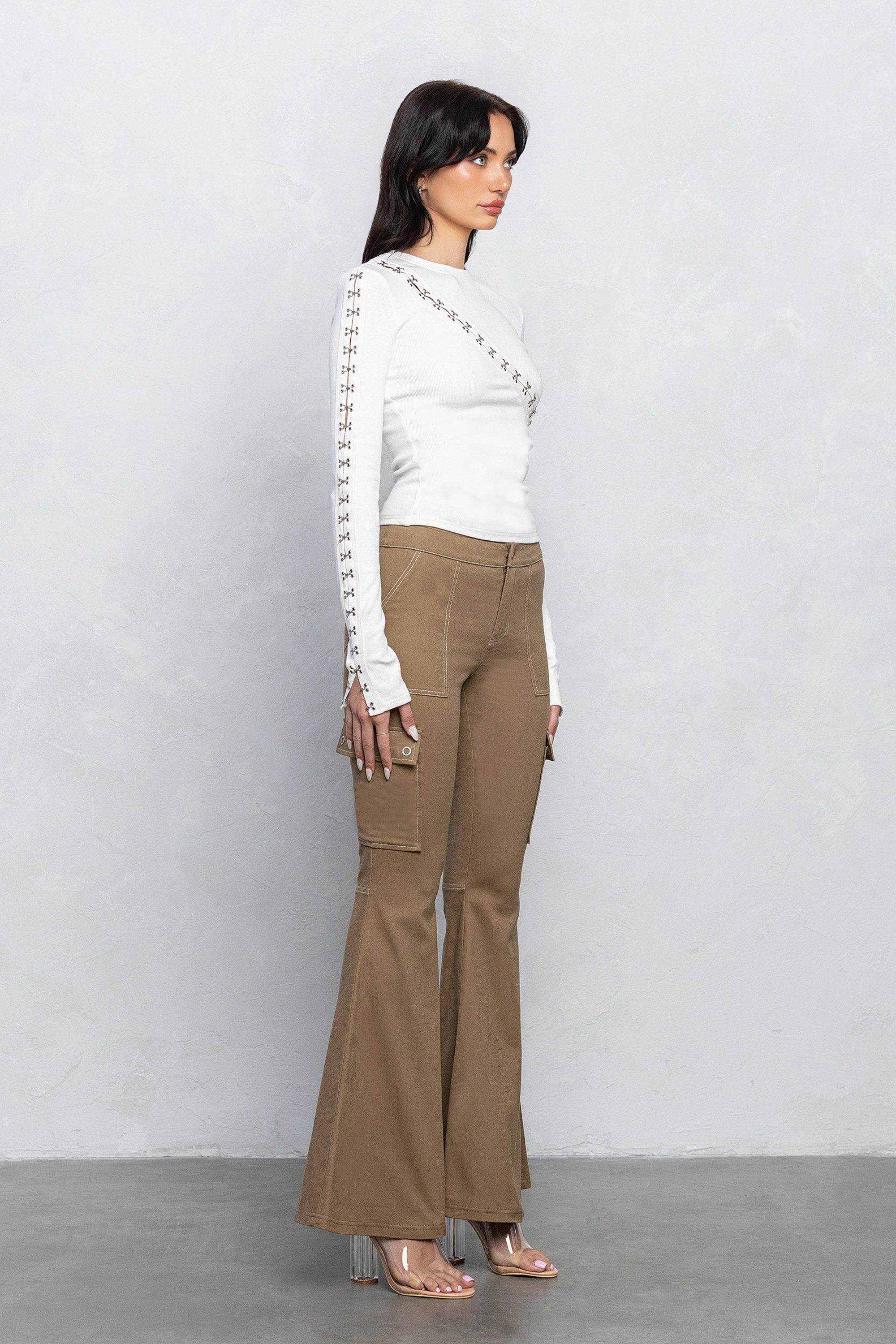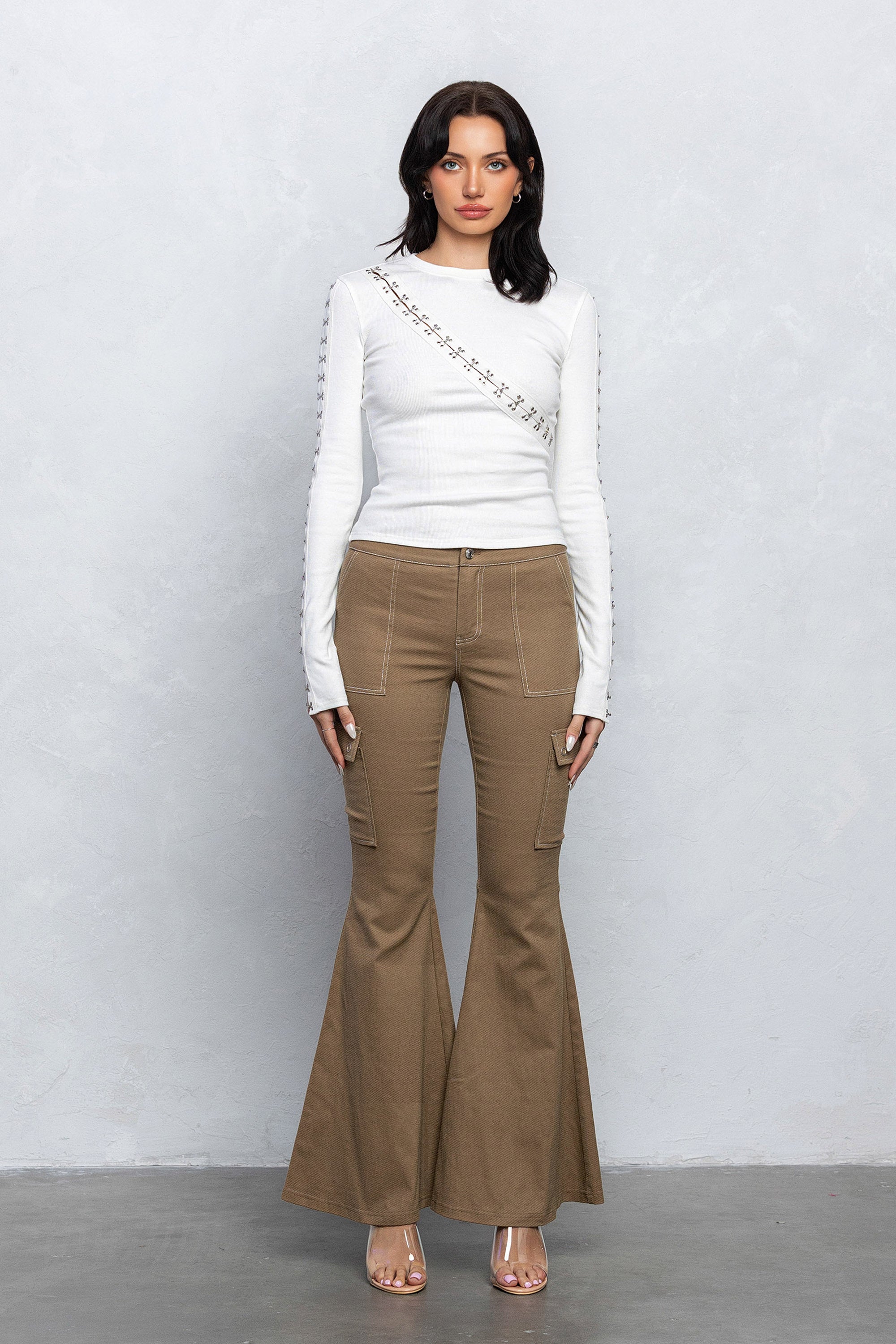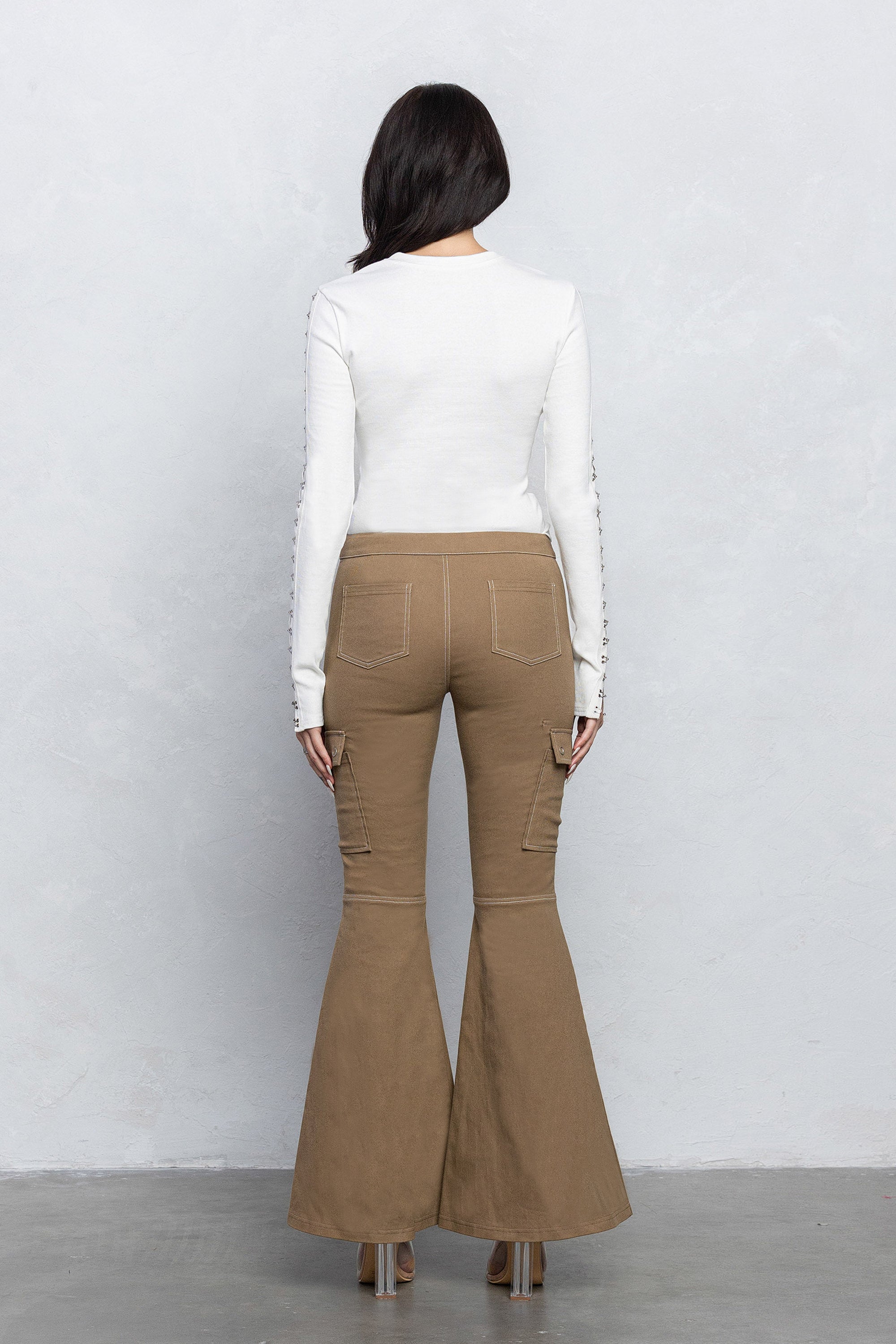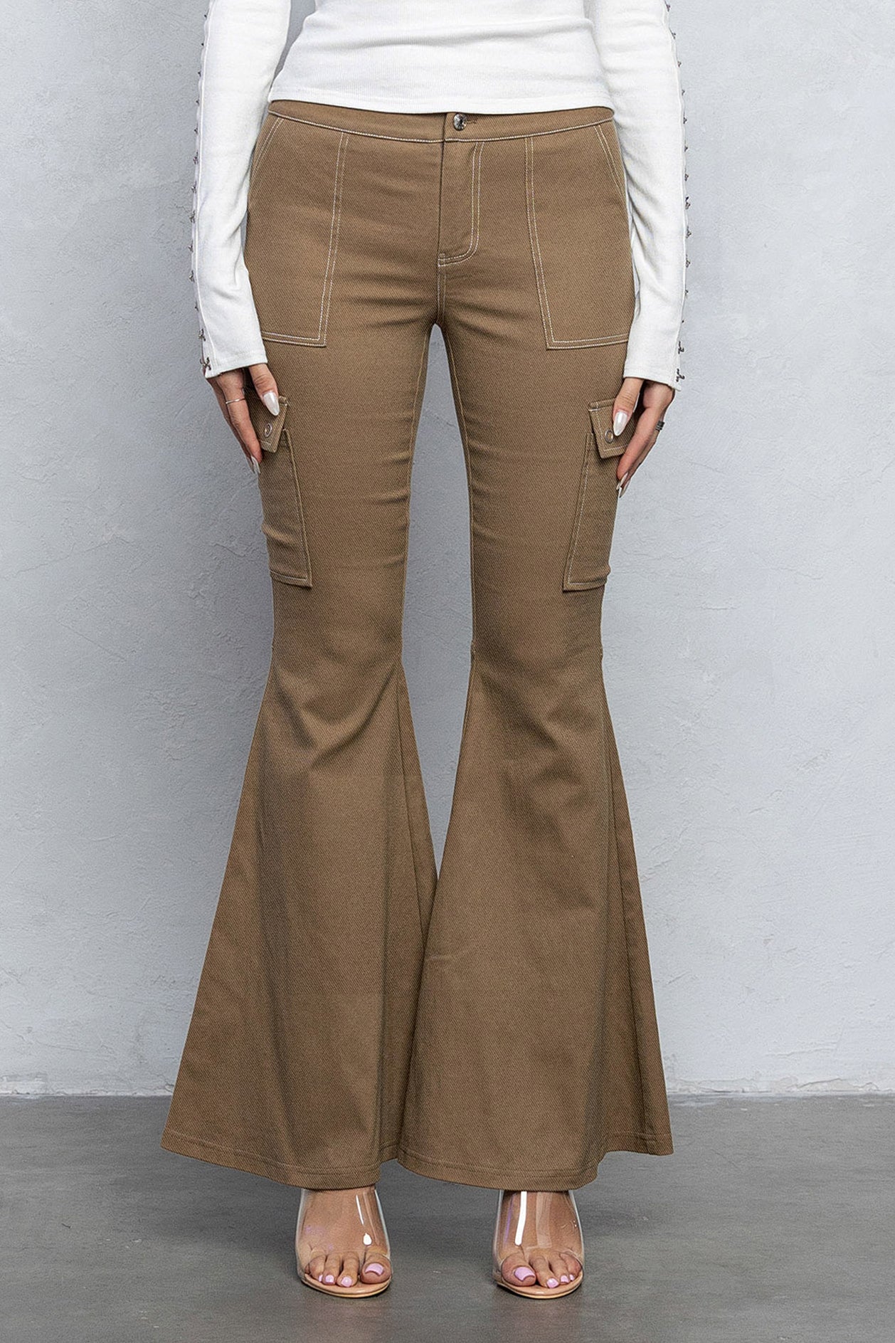 The Halle cargo bell bottom pants are made from a thick and stretchy twill material, designed to have a low rise fit and wide bell bottoms. This pants features contrast double stitching details with cargo pockets on the sides.