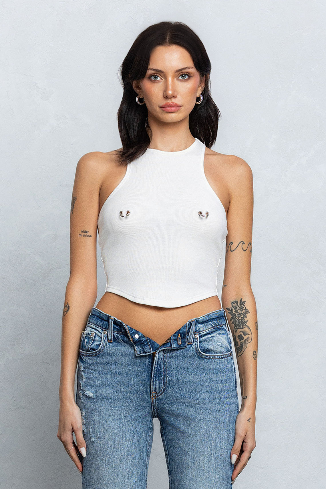 The Pierced sleeveless tank top is made from a soft and stretchy ribbed material designed to have an cropped length. The main feature for this top is the nipple piercing details & racerback.