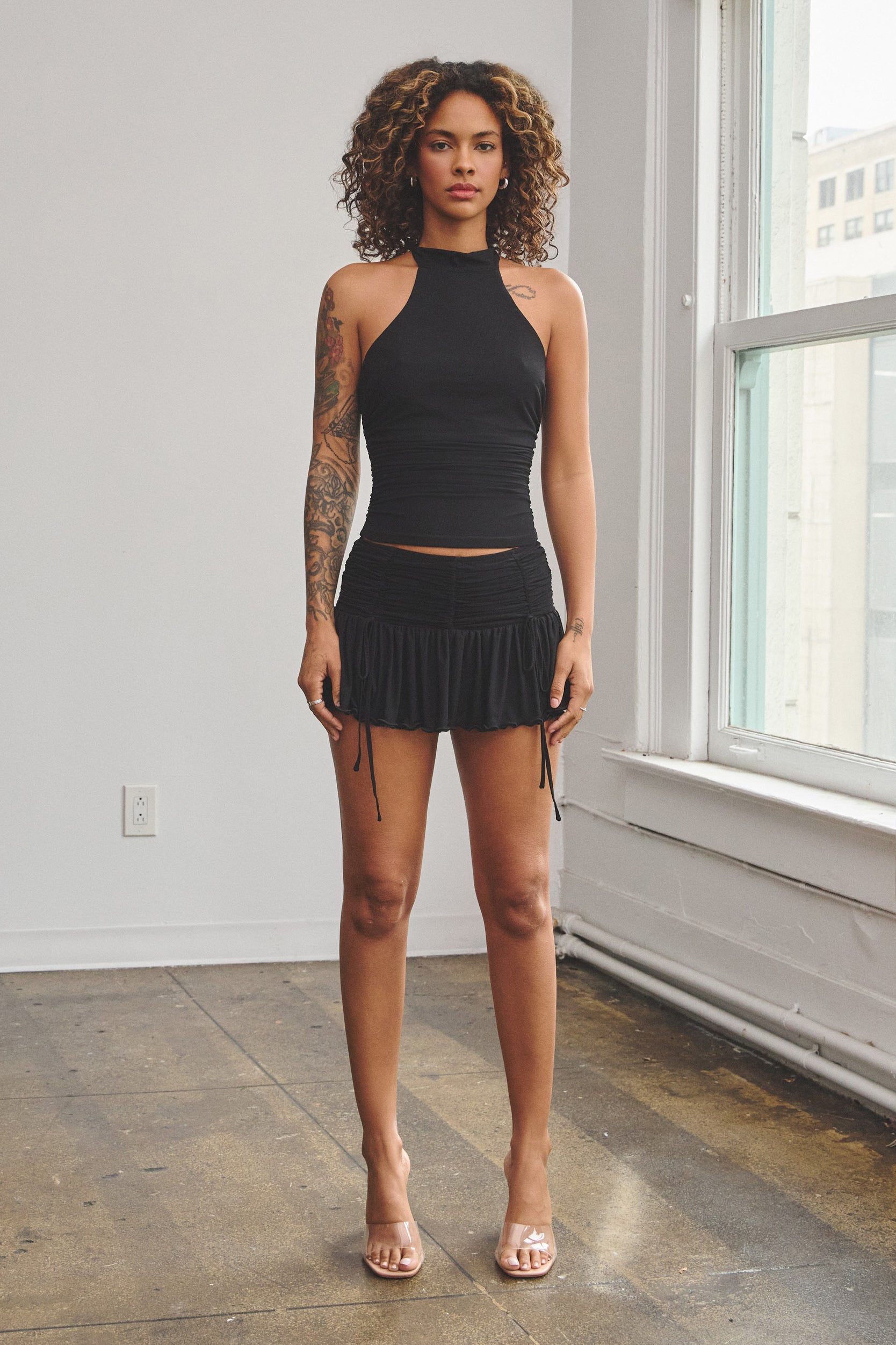 BELLA RUCHED MESH HALTER TIE TOP