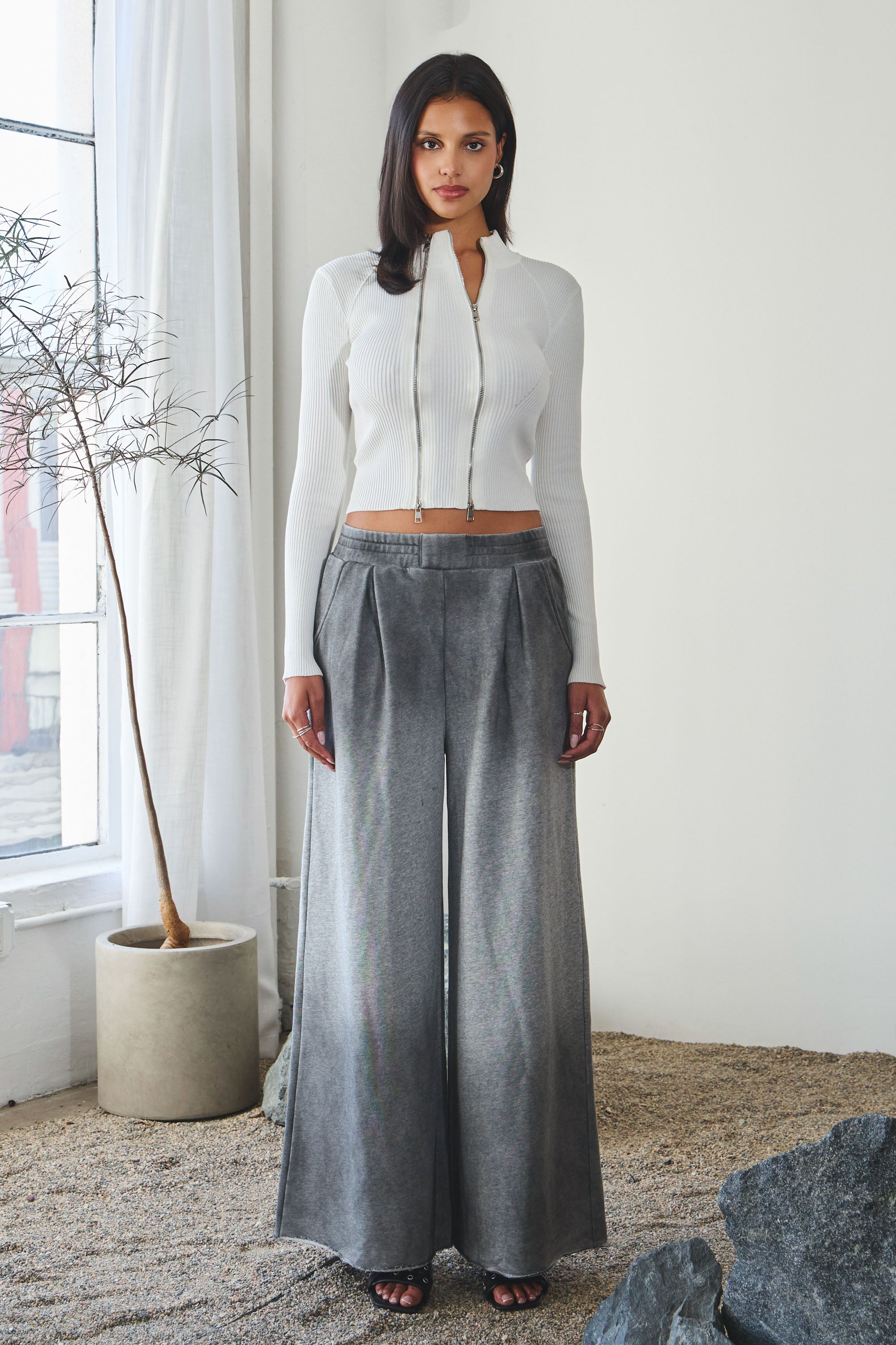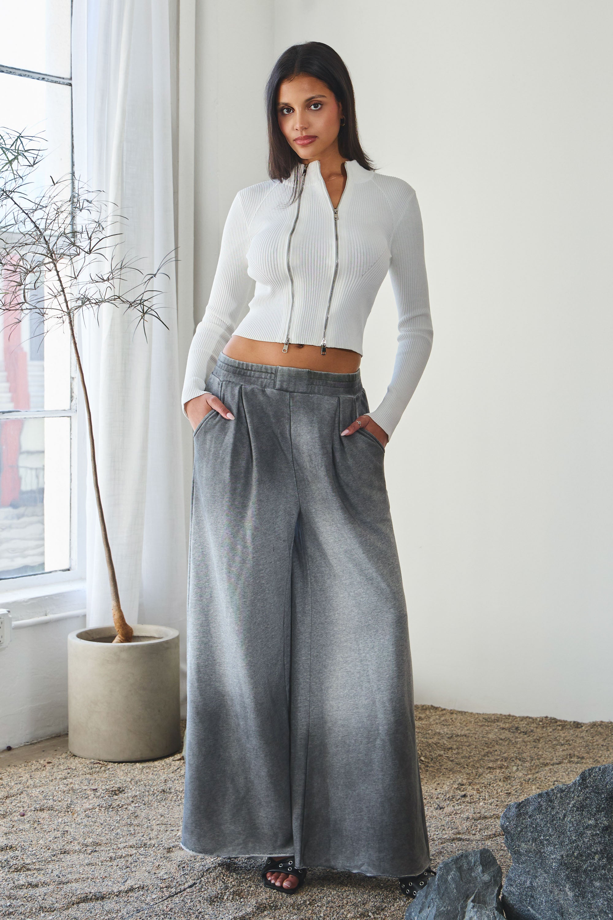 The Dusk Washed Sweatpants is crafted from a thick French terry fabric and designed with a gradient highlight wash effect. It features an elastic waistband, a wide-leg fit, a raw-hem cutline, and a clean pintuck detail.