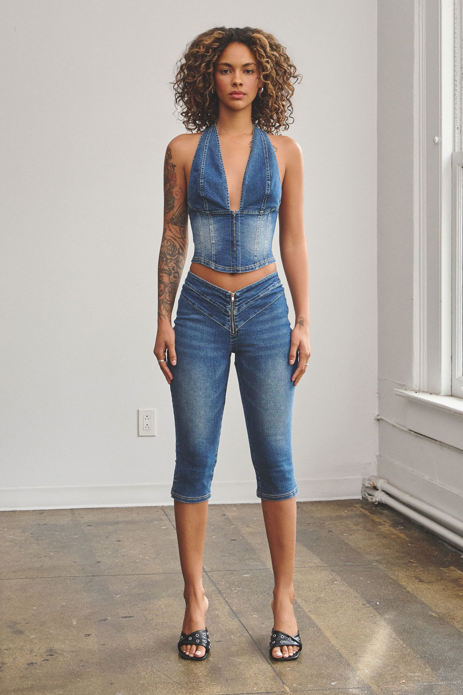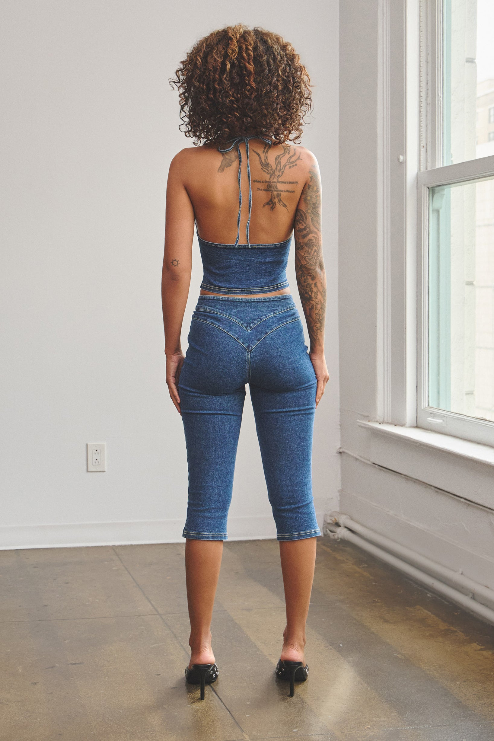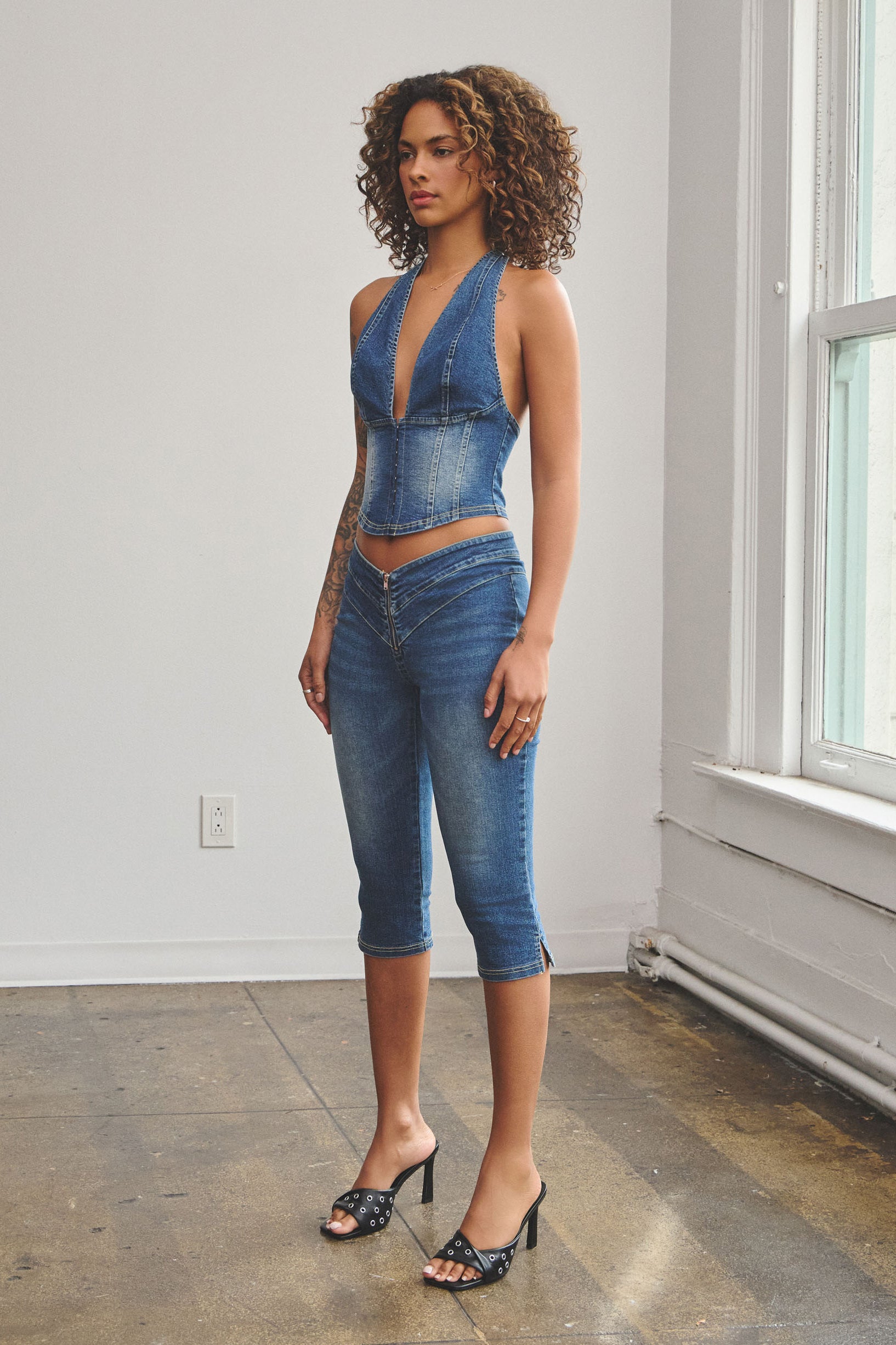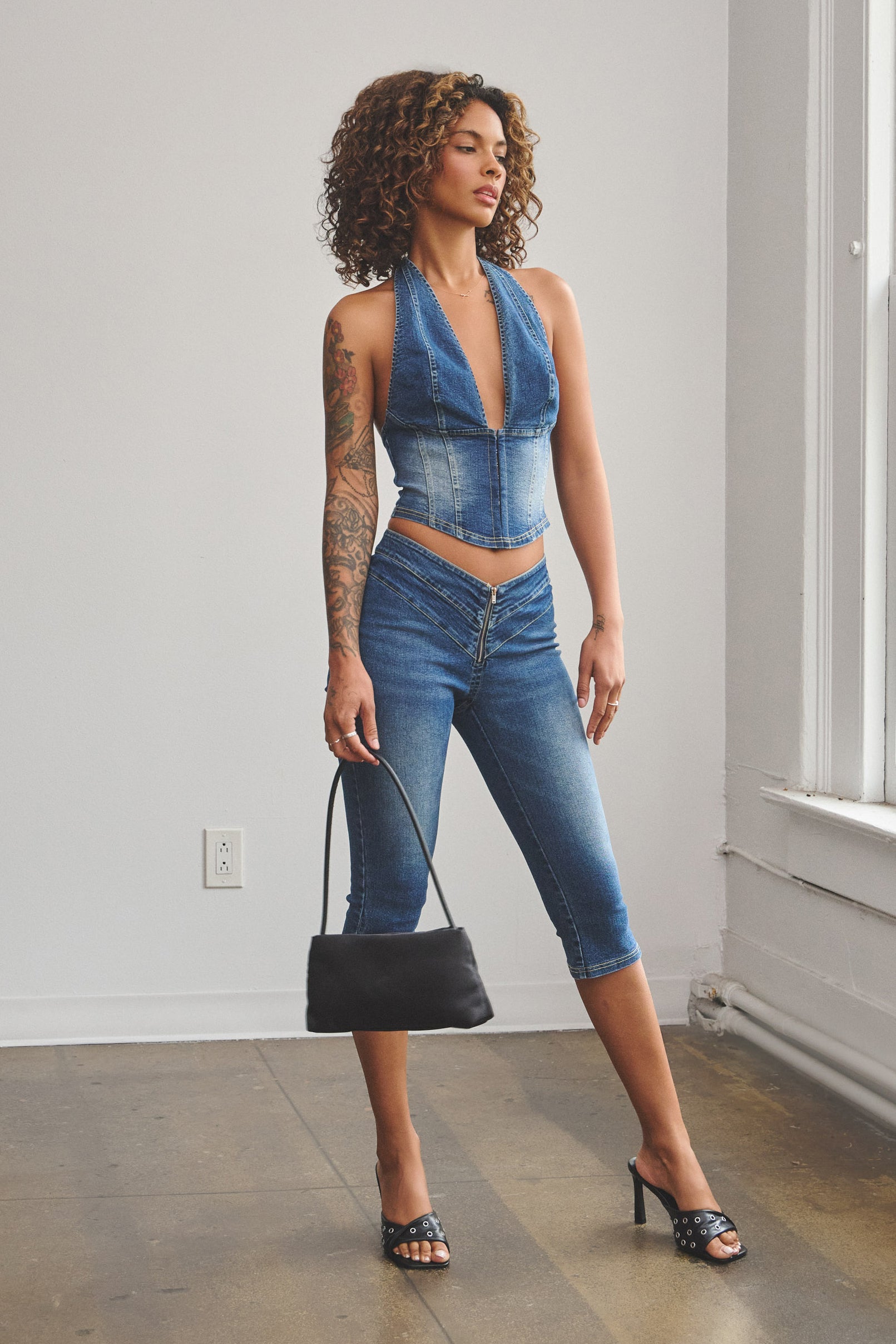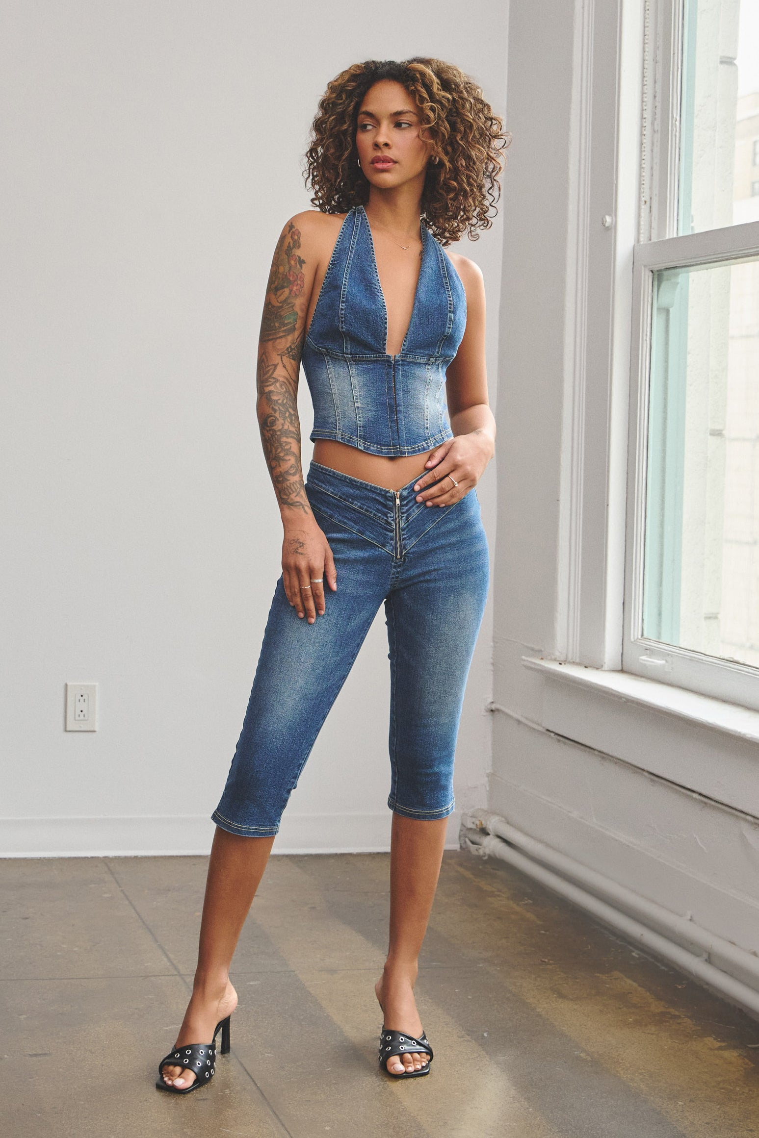 The Nuvia Denim Capri Pants are made from soft, stretchy washed denim that moves with you. They feature a flattering V-cut waistline and a sleek front zipper closure—perfect for adding a little edge to your everyday look.