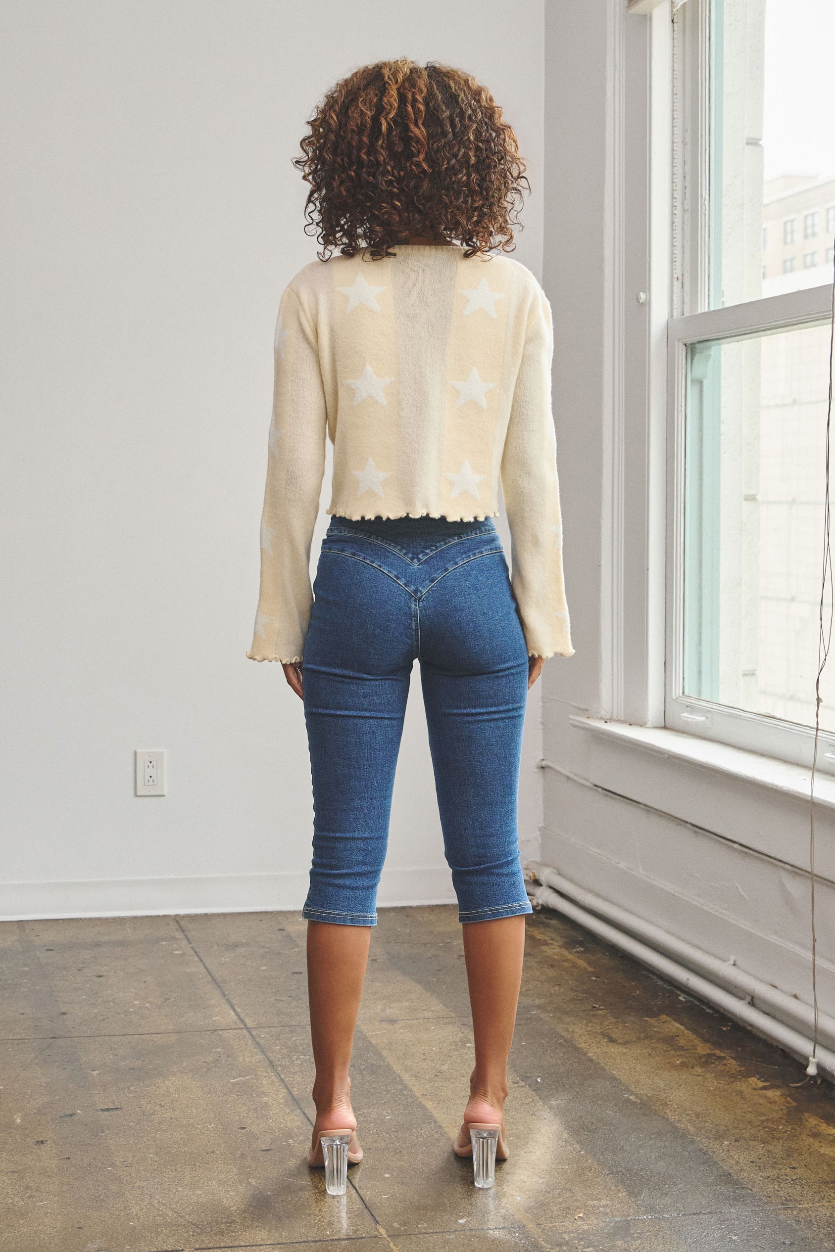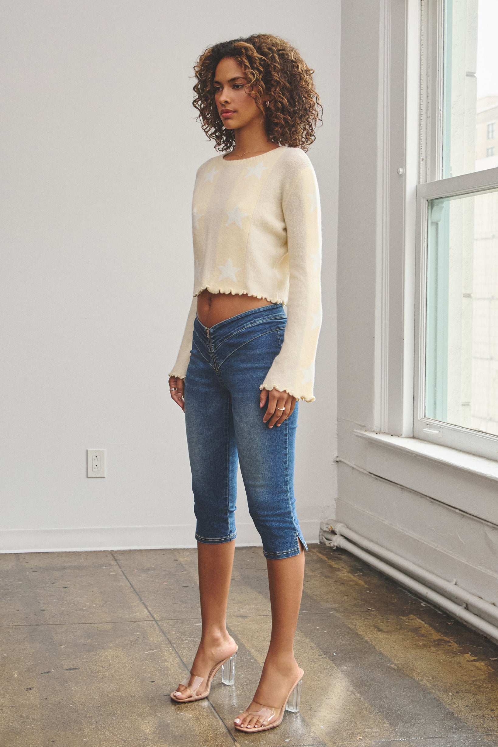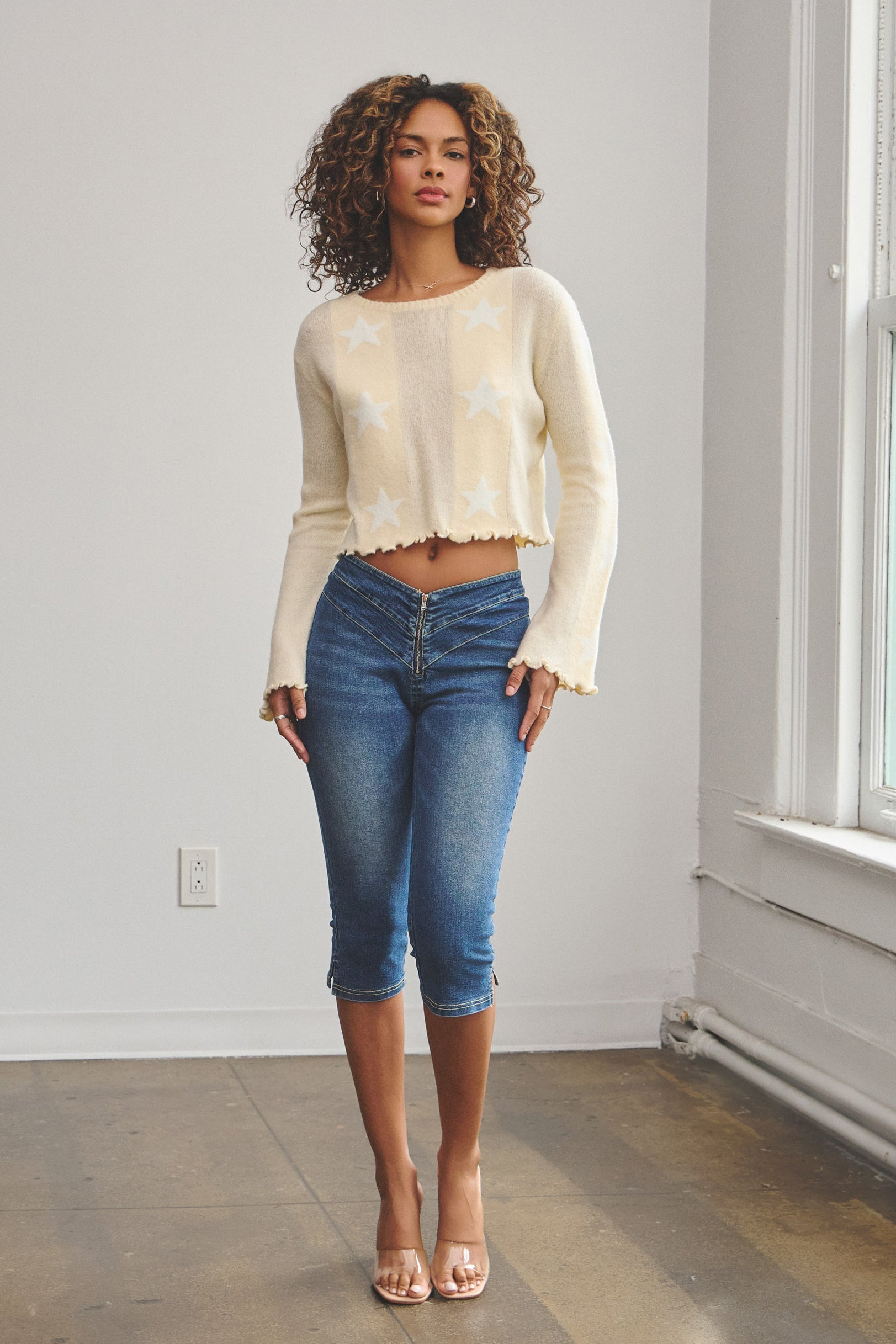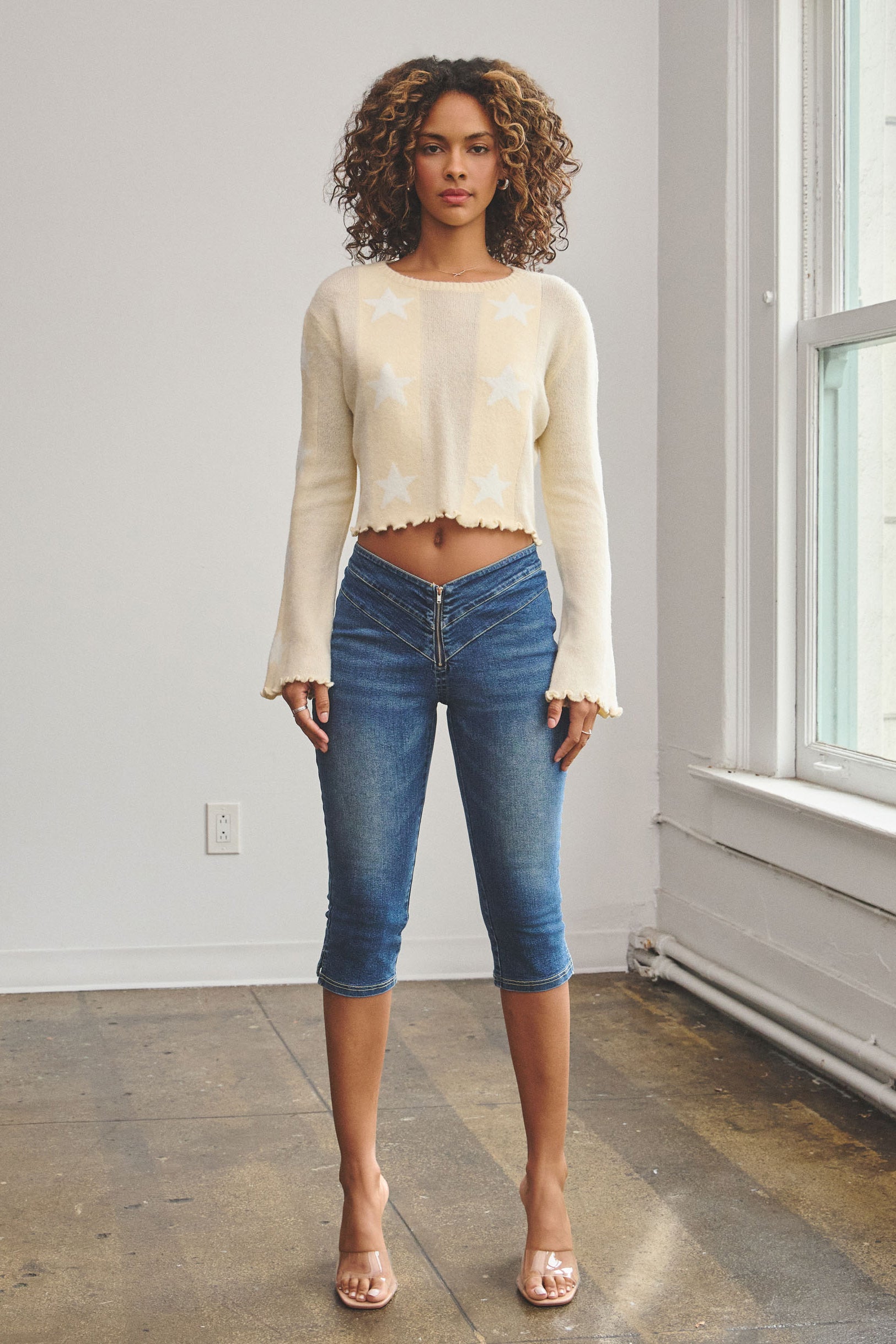 The Star Print Knit Sweater is made from a soft and light yarn that features a cropped fit. It is designed with a round neckline, bell sleeves, and lettuce-edge hems for a playful, feminine touch.