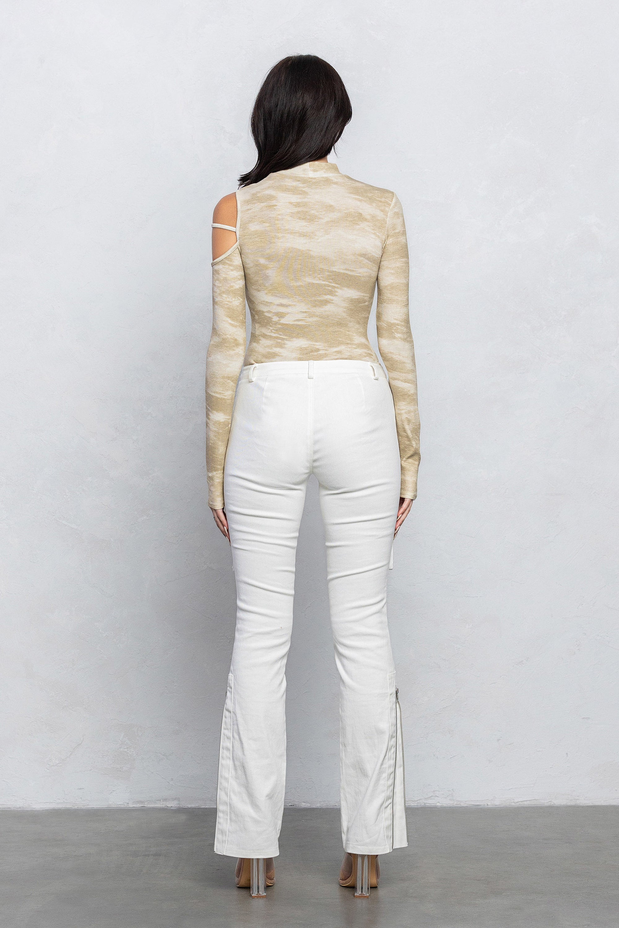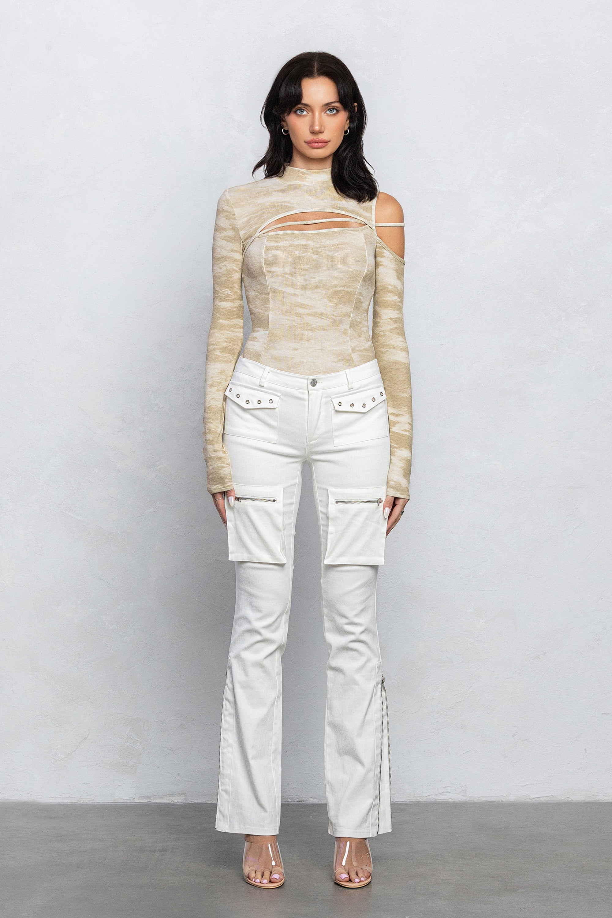 The Shara long sleeve cut out bodysuit is made from a marble printed ribbed material designed to have a good stretch. It features a chest cut out, one shoulder cut out and string detail. This bodysuit has an button closure.