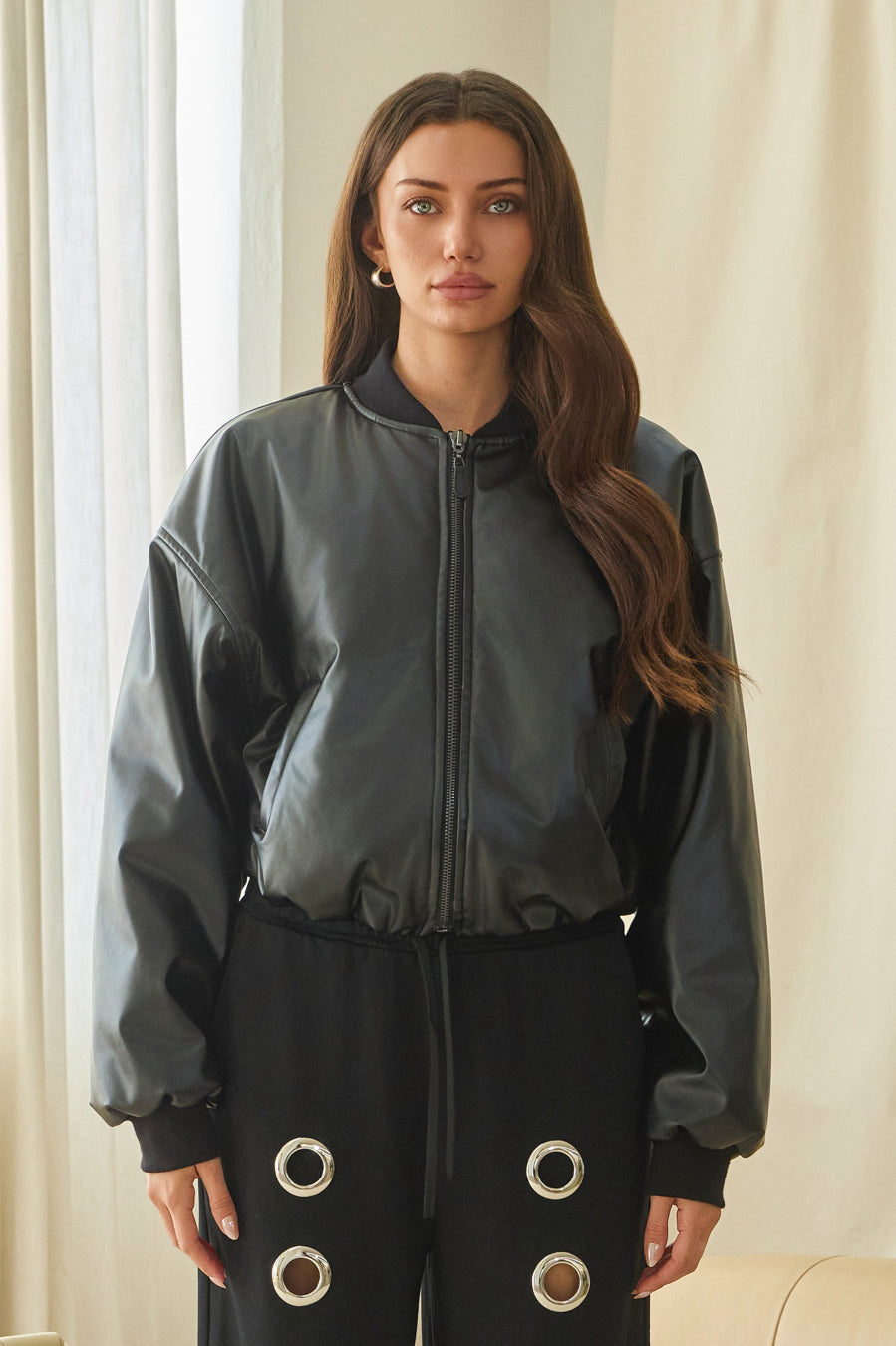 LEXY LEATHER V-CUT ZIP-UP MOCK NECK TOP - BLACK