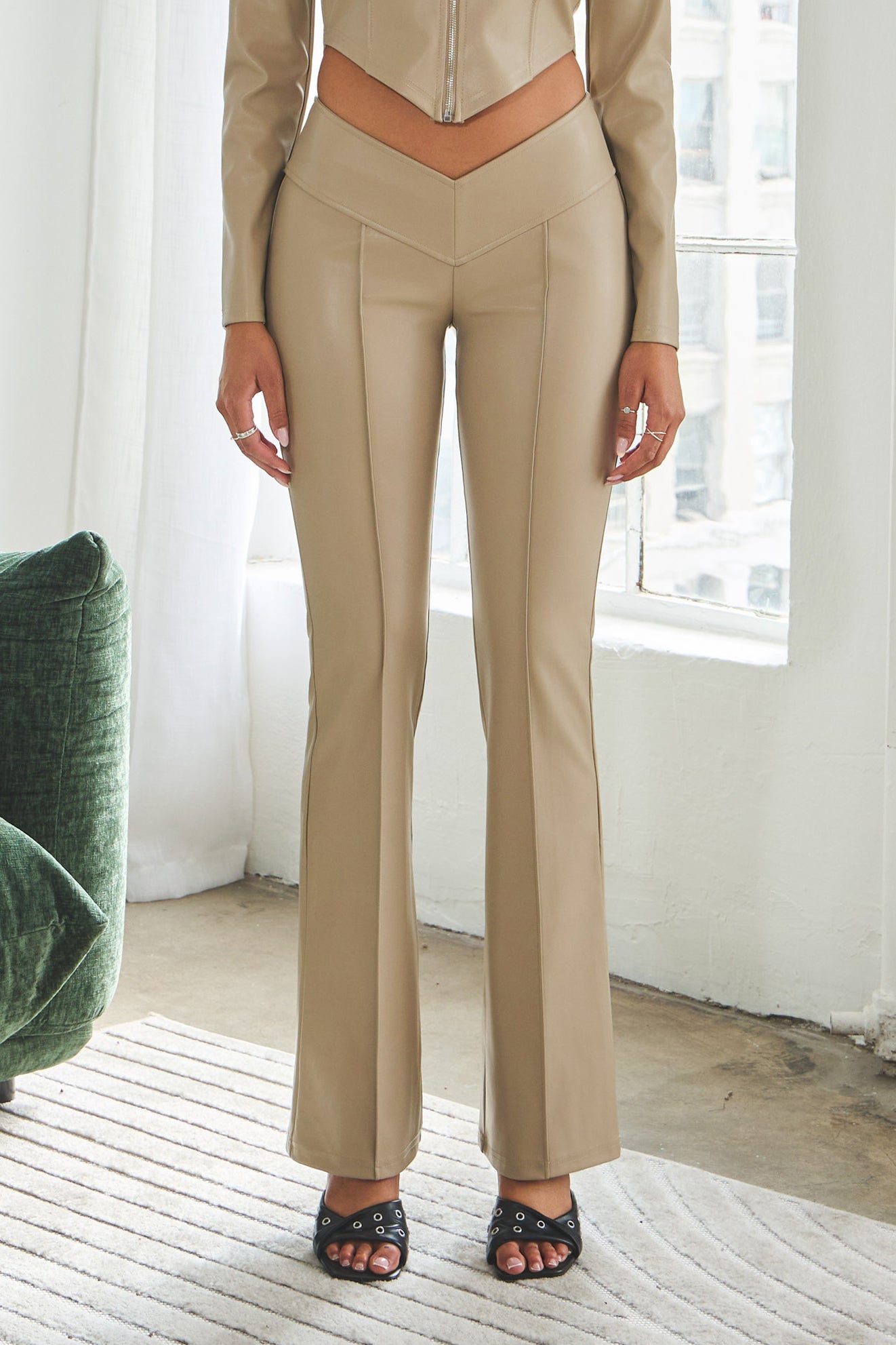 LEXY LEATHER V-CUT FLARED PANTS - TAN