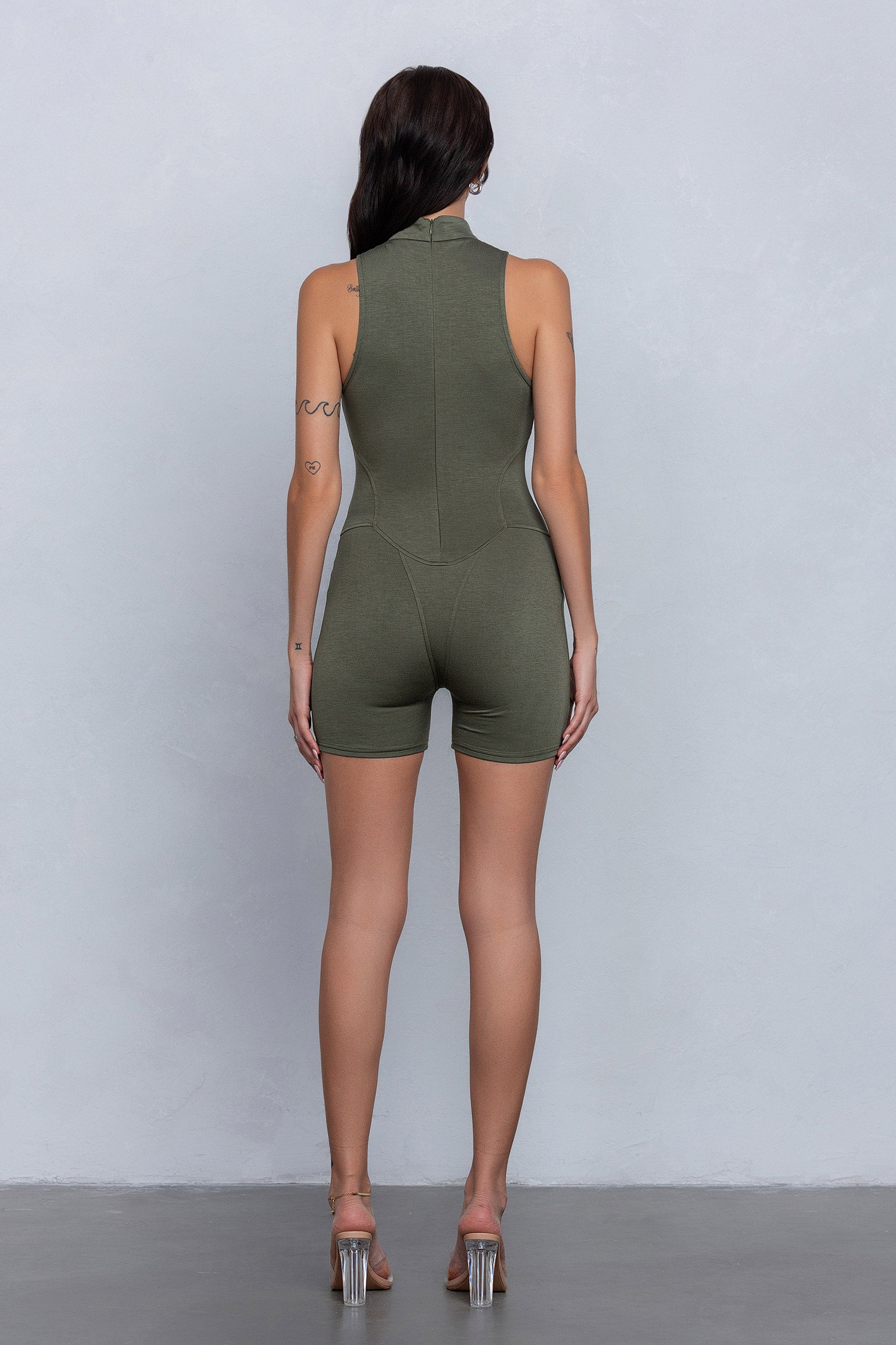 The Pixi sleeveless mock neck romper is made from a soft and stretchy jersey material designed to accentuate the natural body line. This romper features a front zipper detail that can have a cut out look with an back zipper closure.