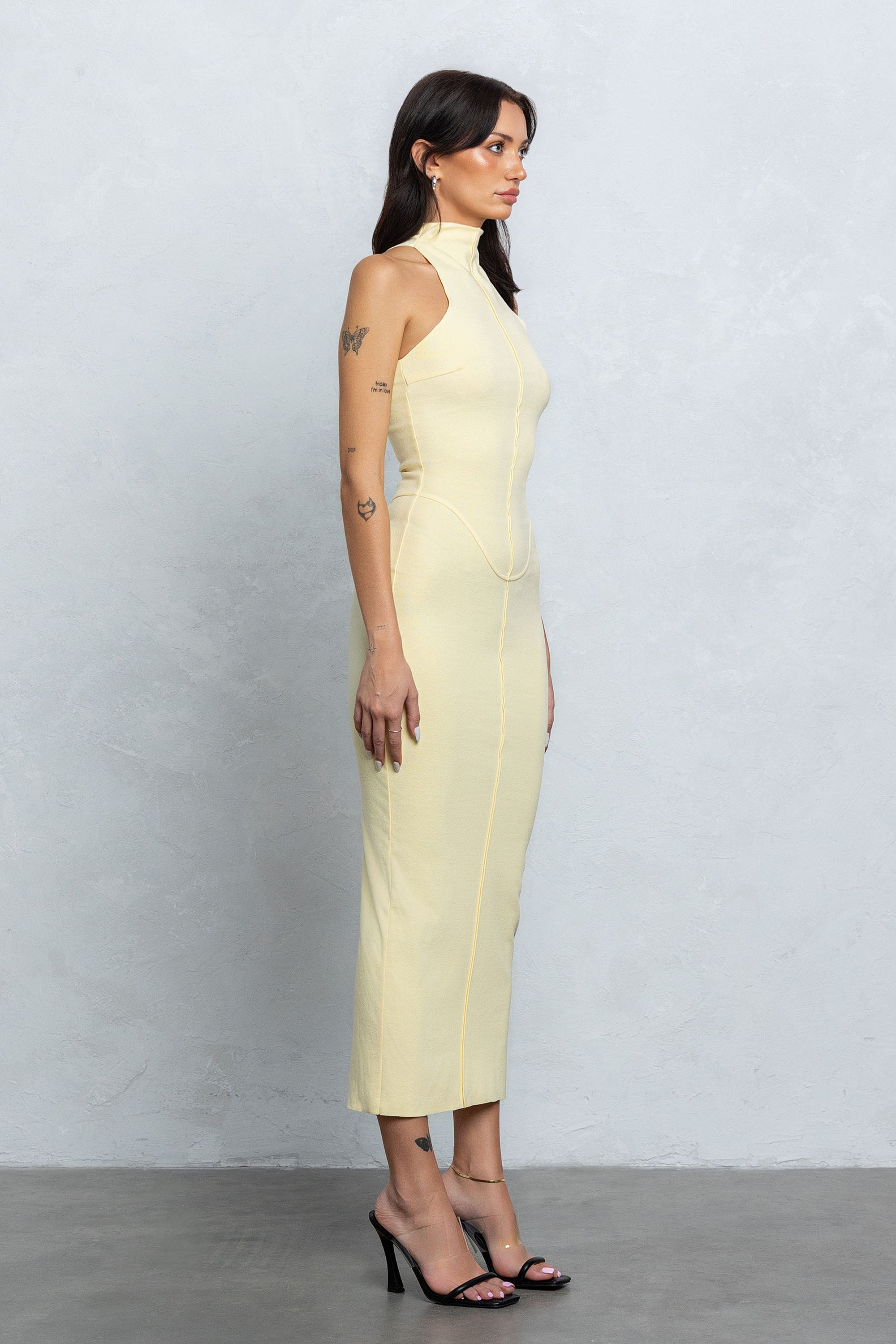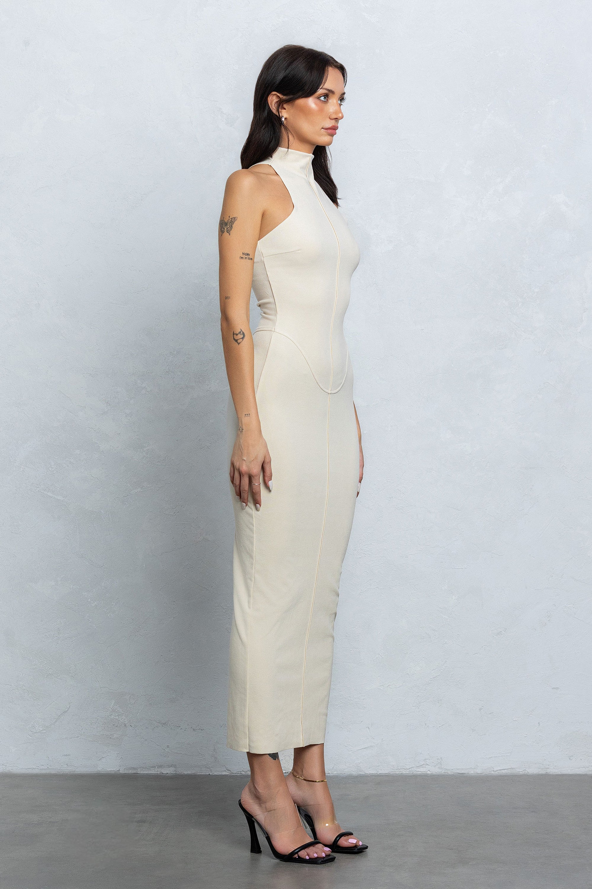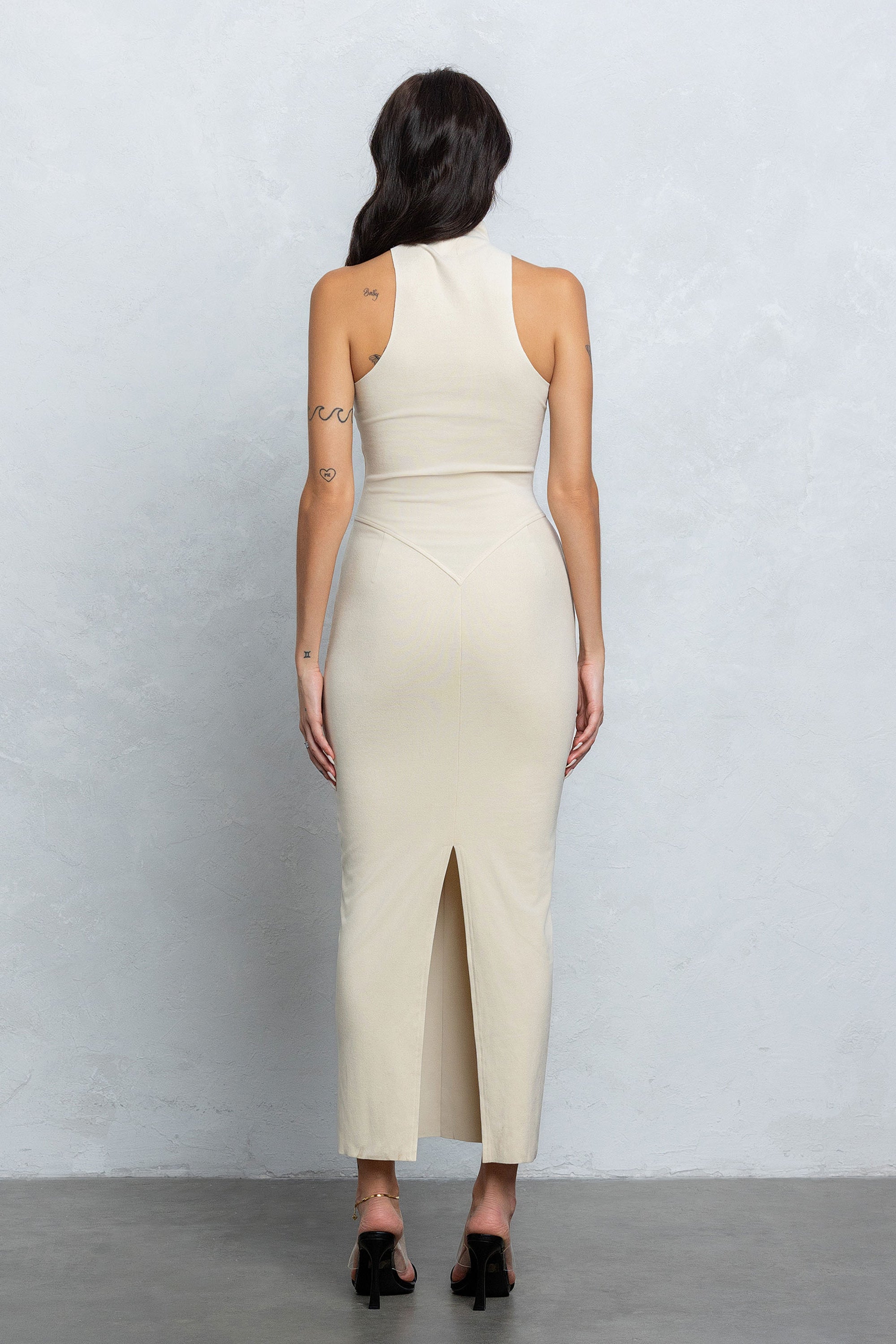 The Kimi sleeveless maxi dress is made with a stretchy ultra soft double sided jersey material designed to hug your body. This dress features a mock neck, back center slit, and top stitch details in the front and back to accentuate the body line.