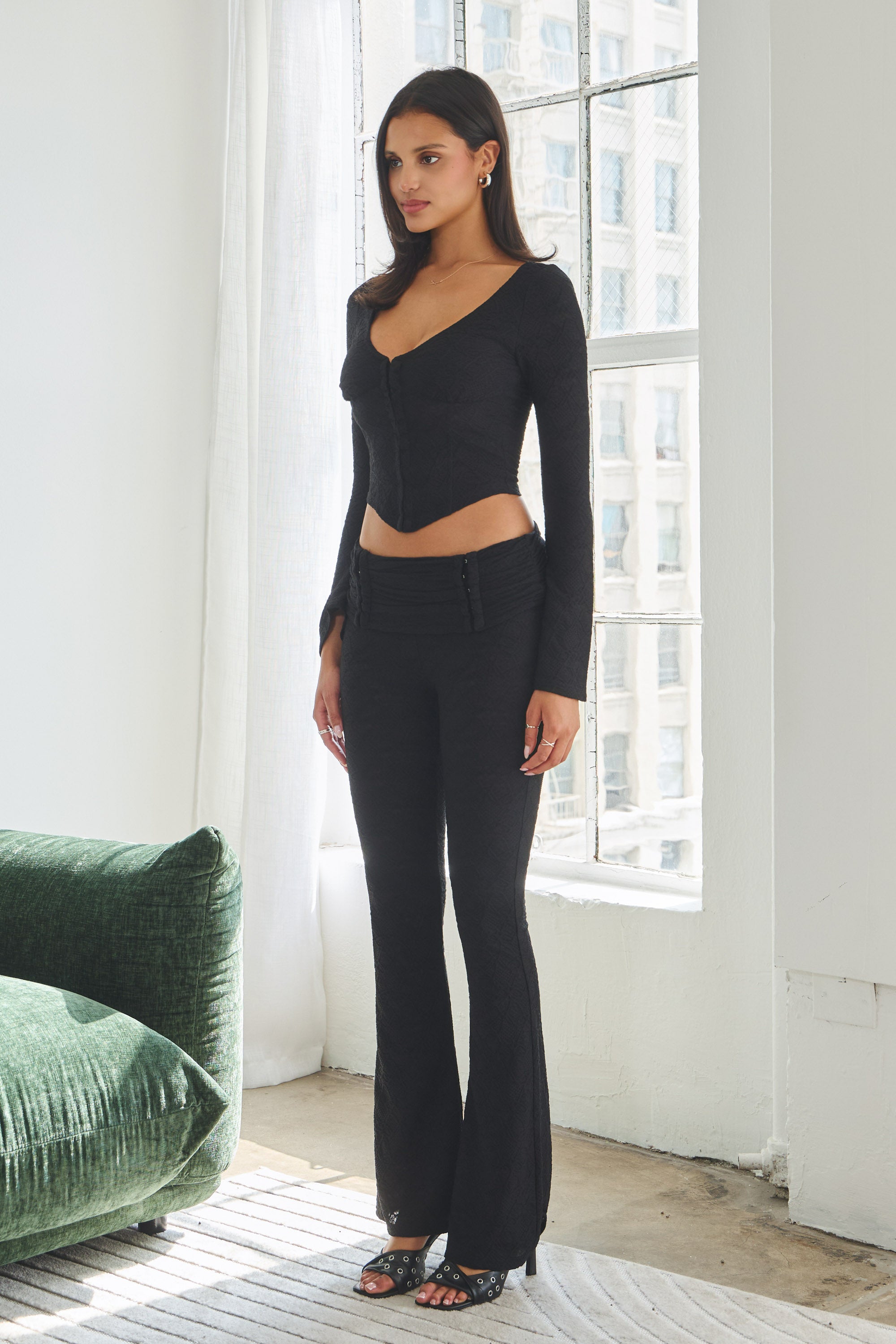 ZELDA TEXTURED LACE FOLDOVER FLARED PANTS - BLACK
