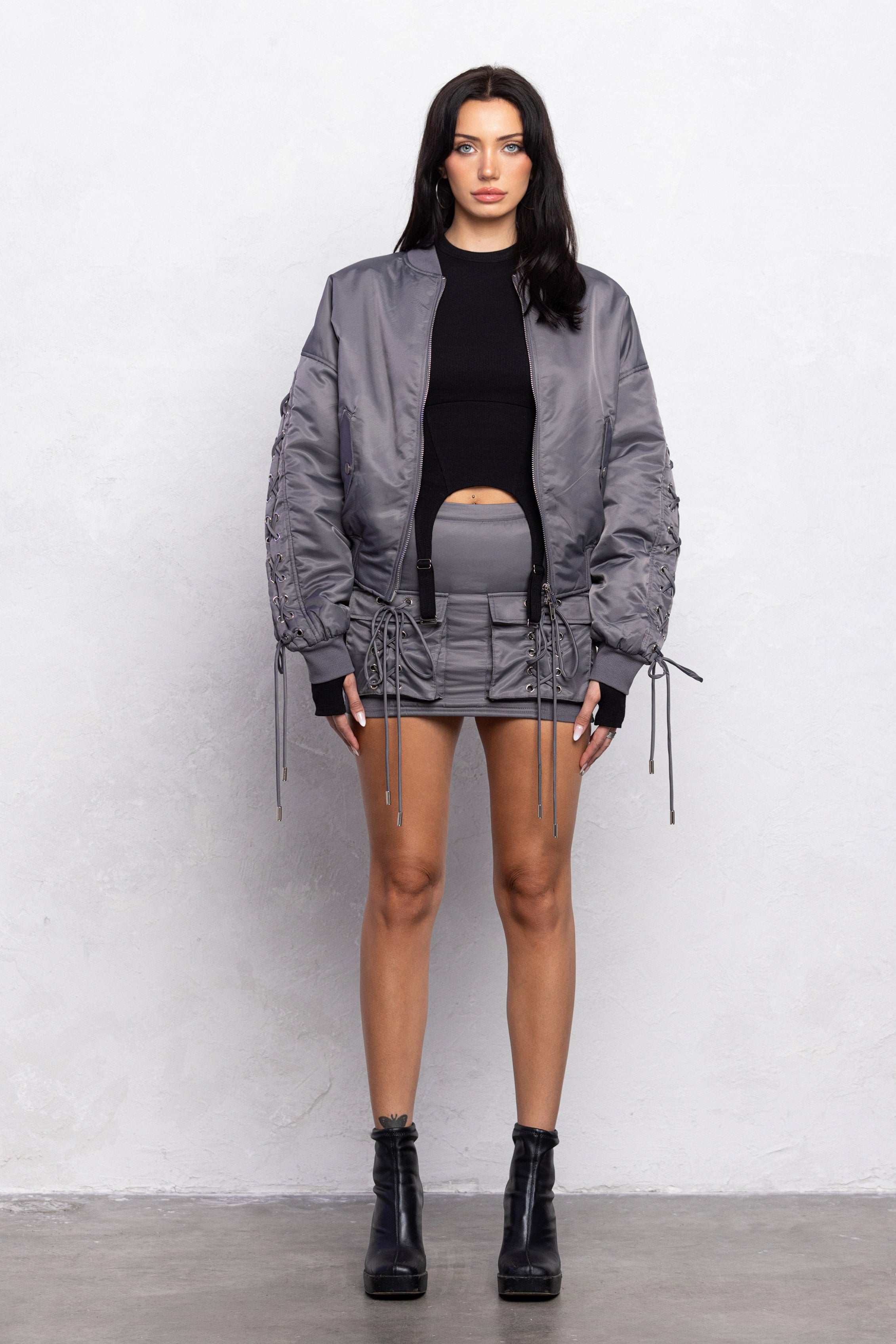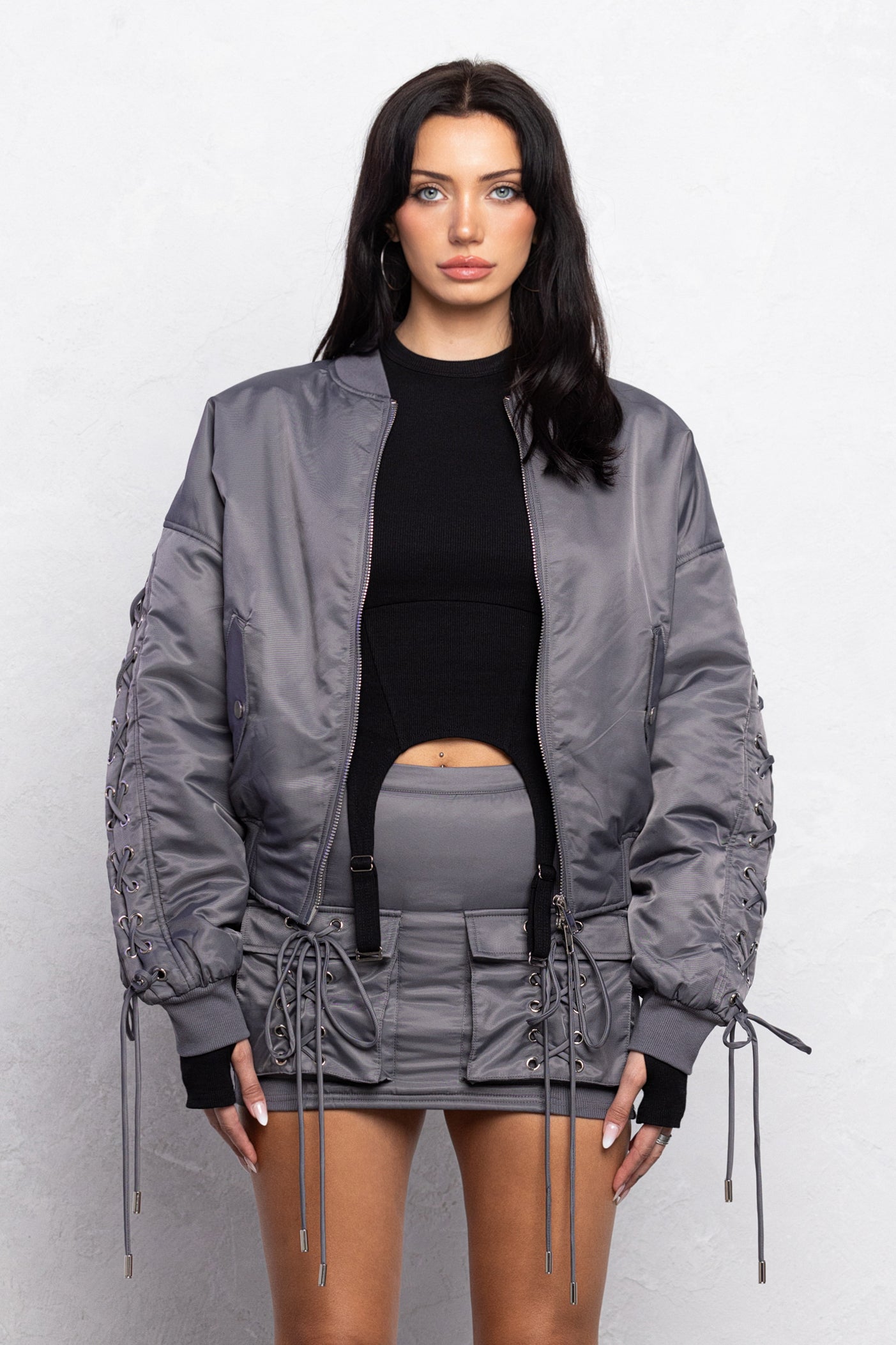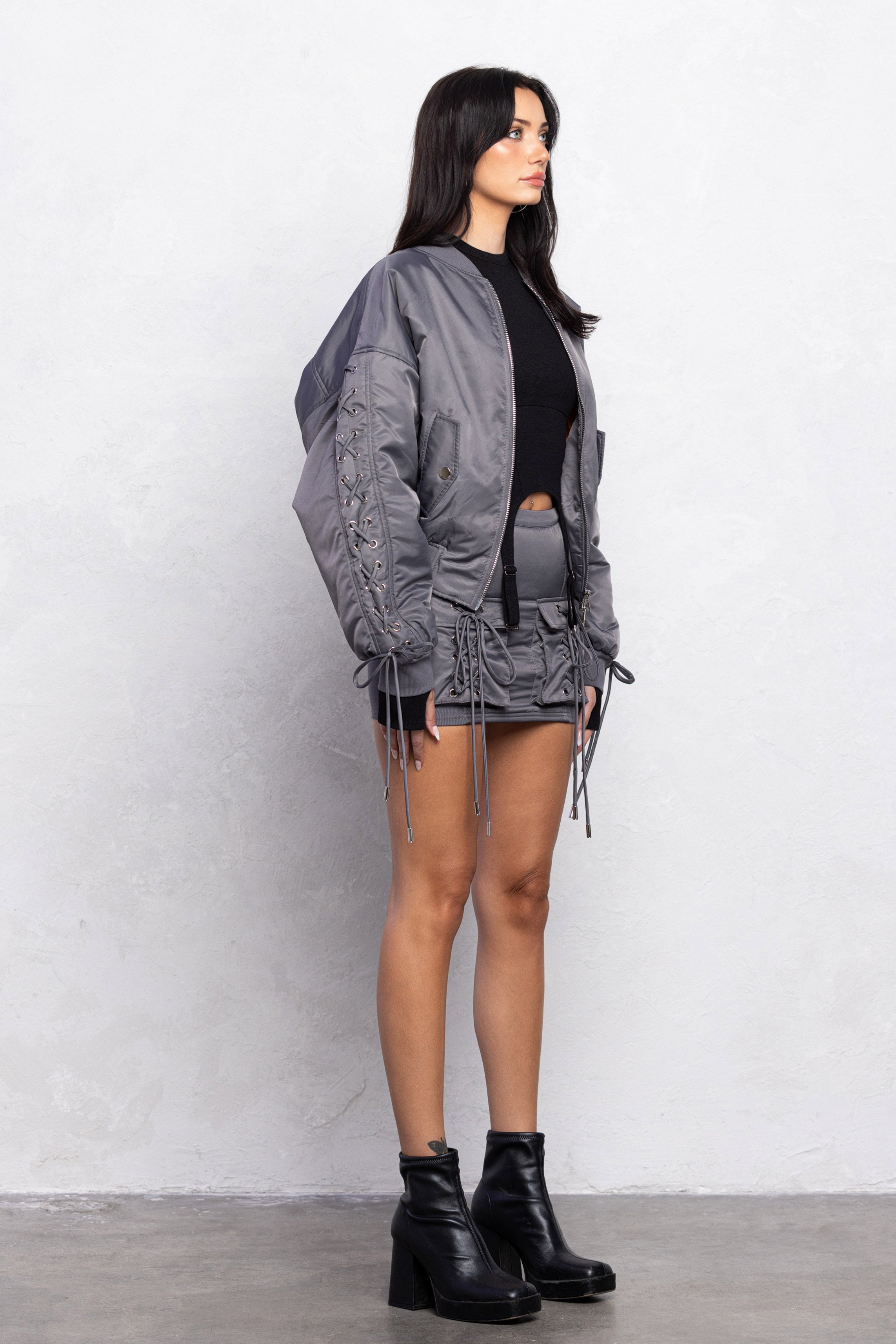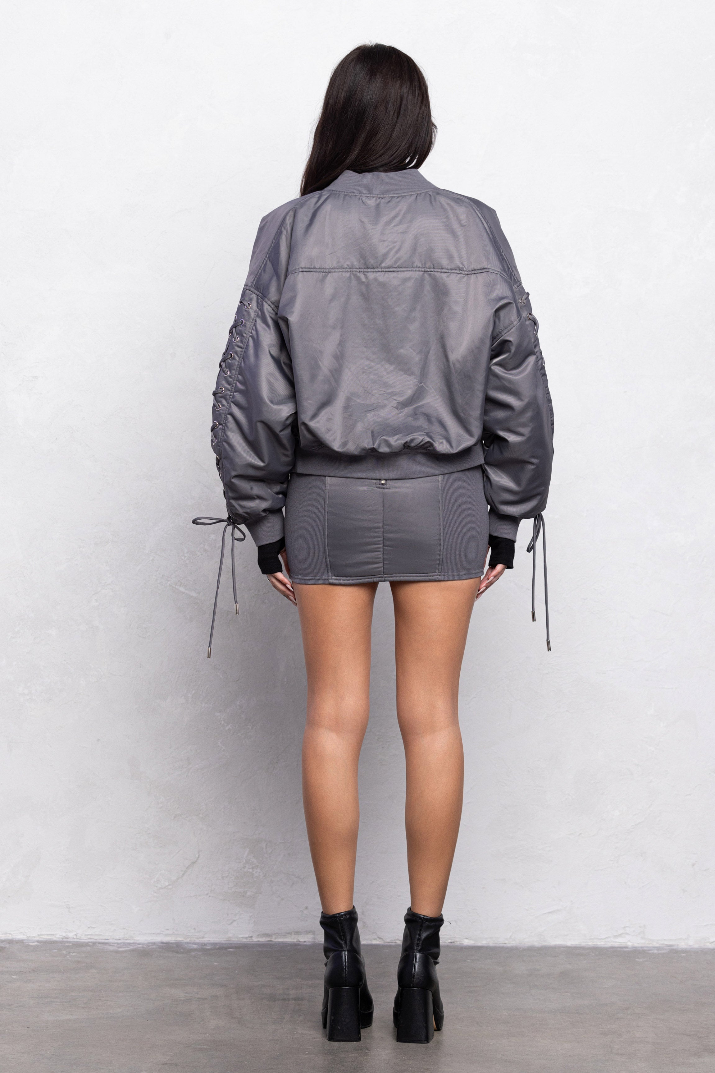 The Devyn bomber jacket is designed to have an overall loose fit with cinching in the waist hem from the contrast ribbed fabric. Features lace up details on the sleeves for a feminine touch.