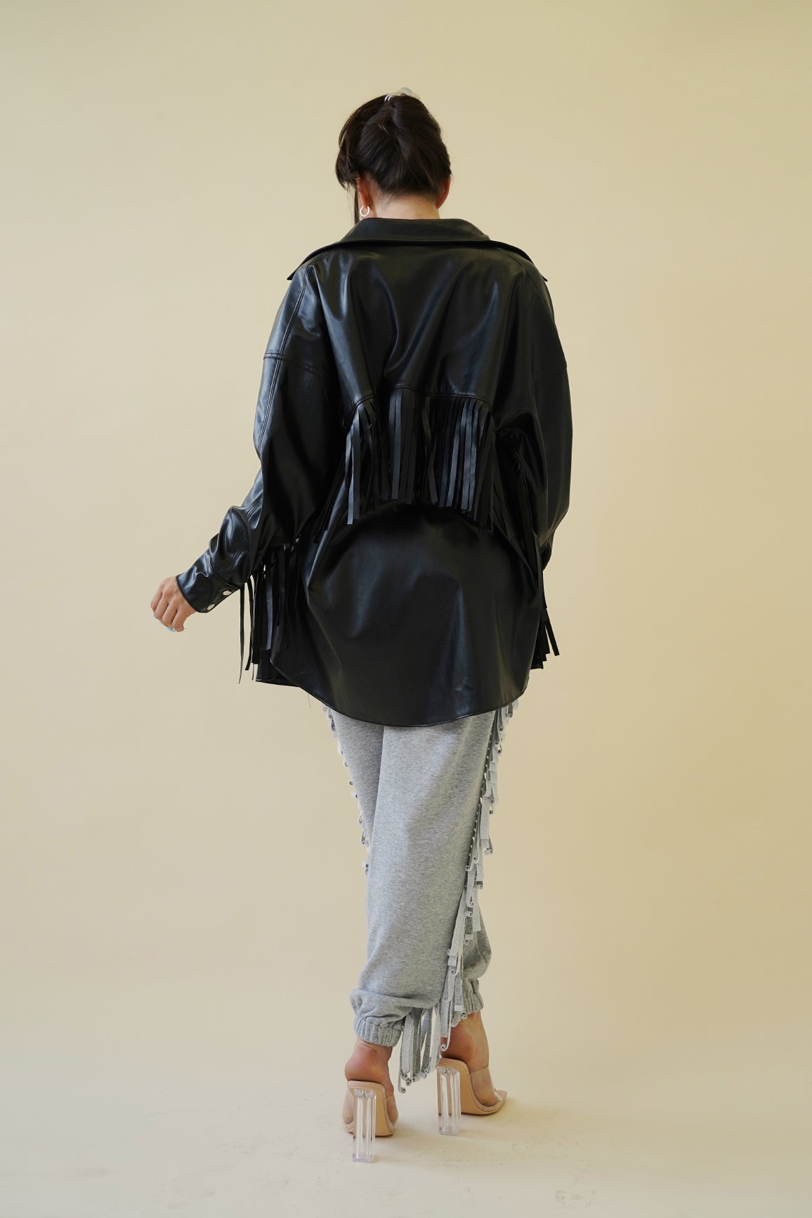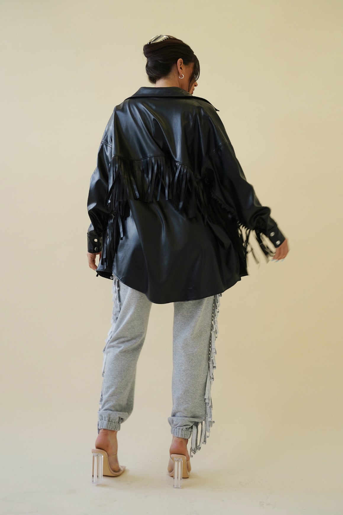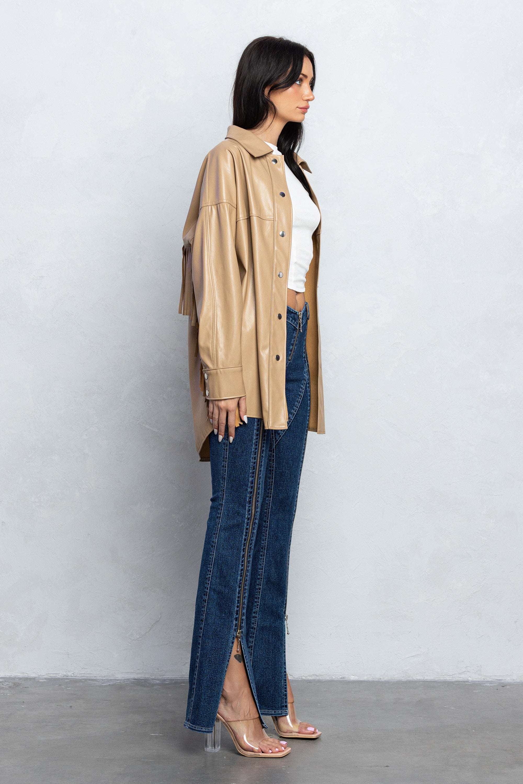 - Faux leather fringe detail shacket