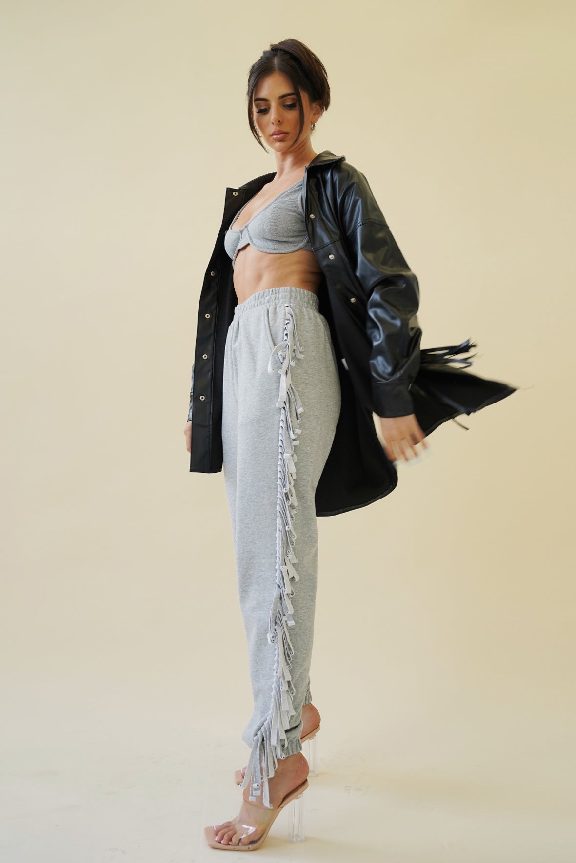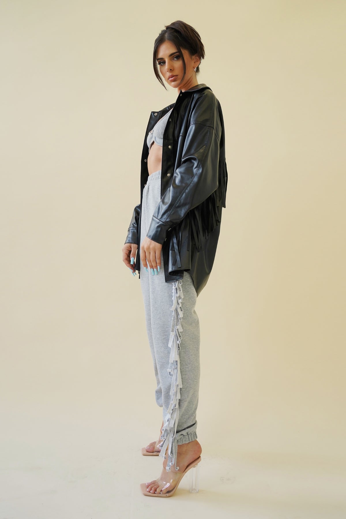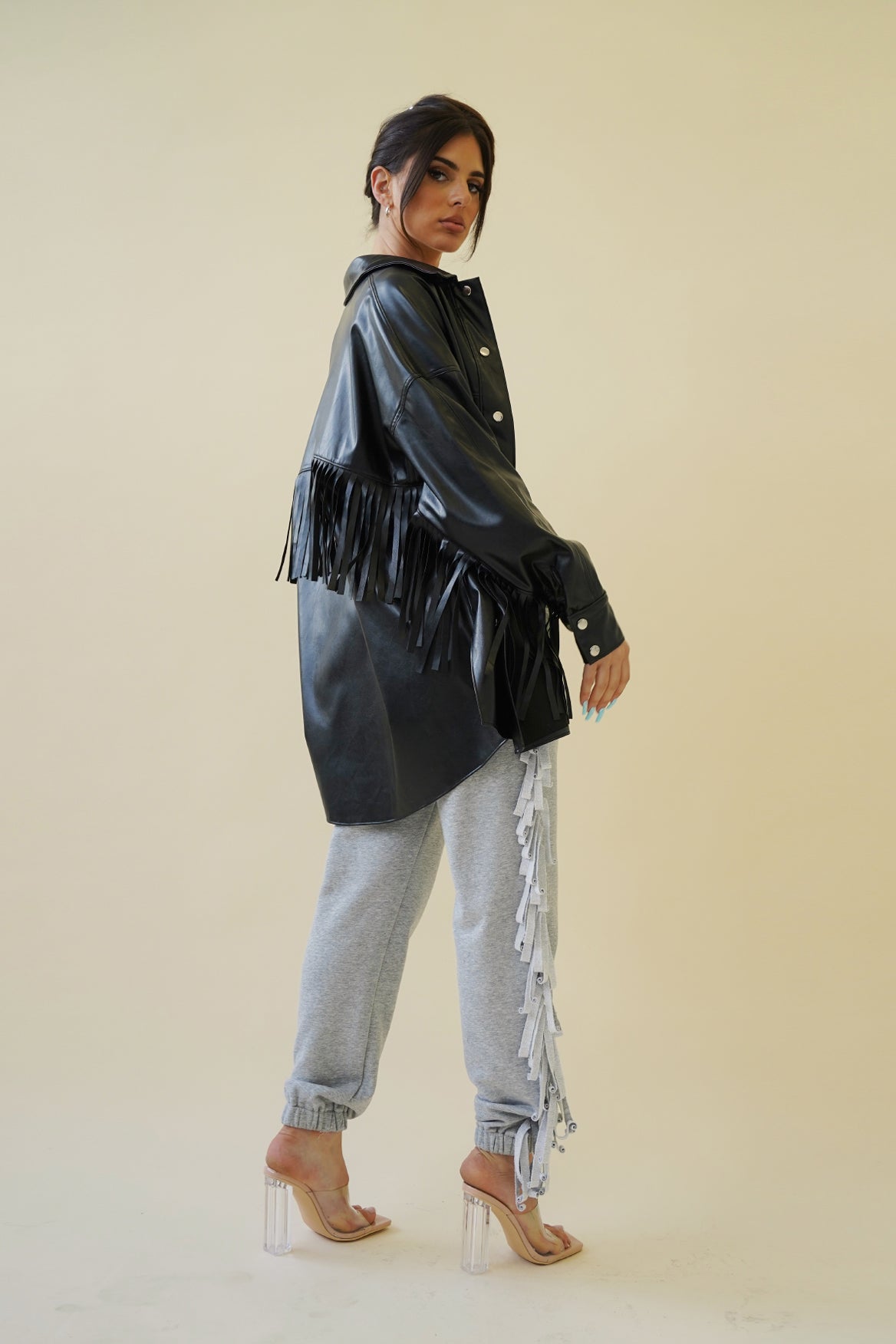 - Faux leather fringe detail shacket