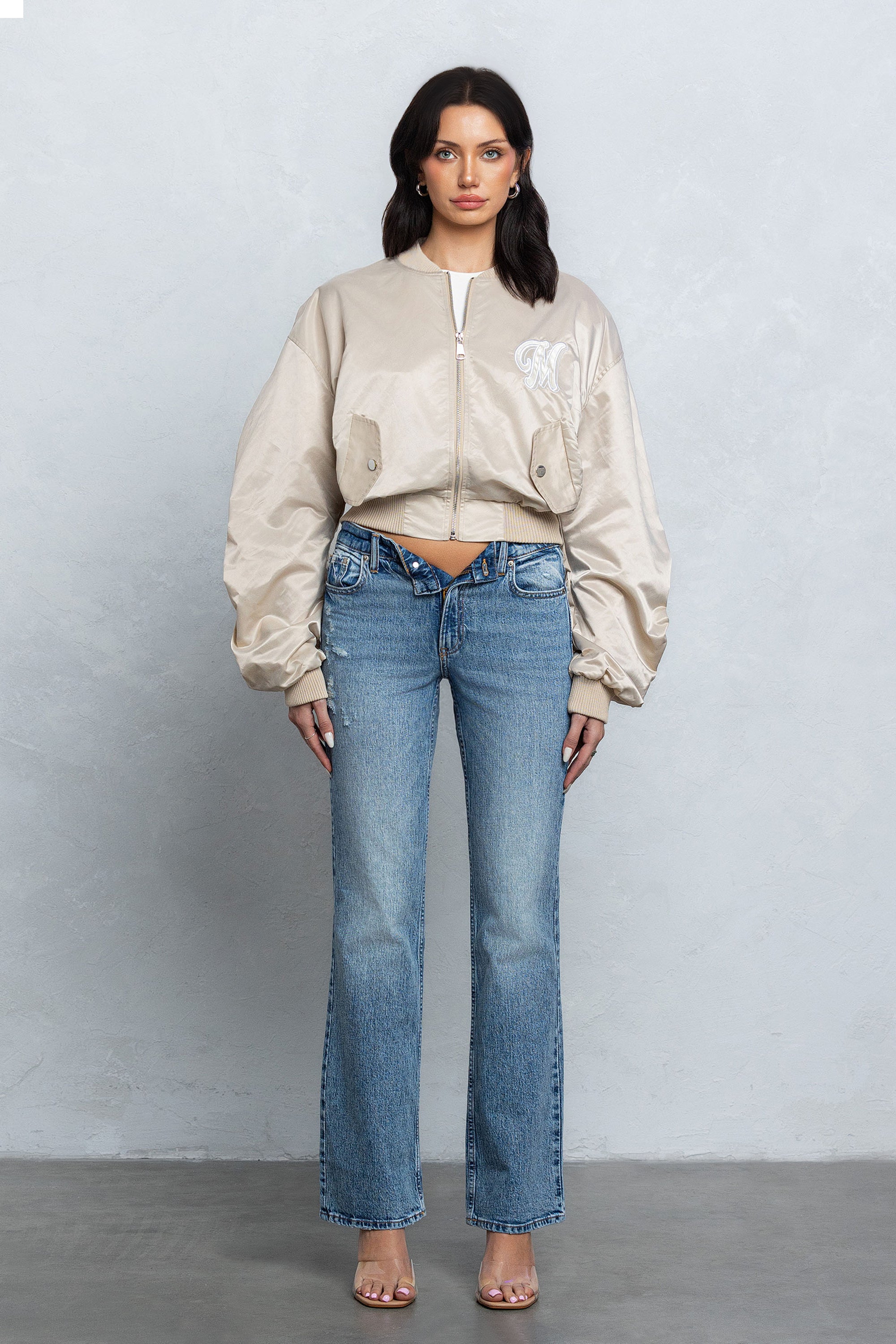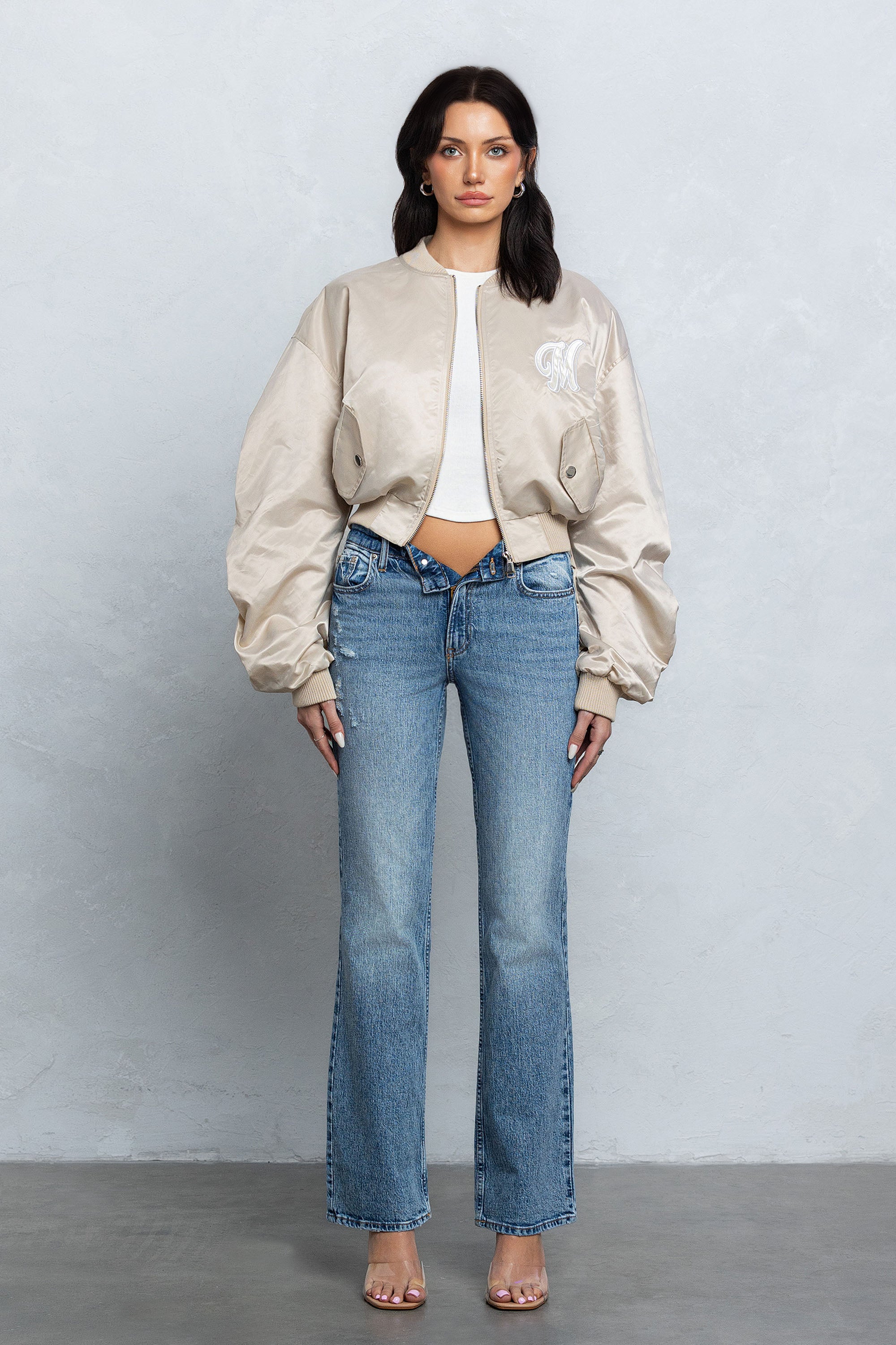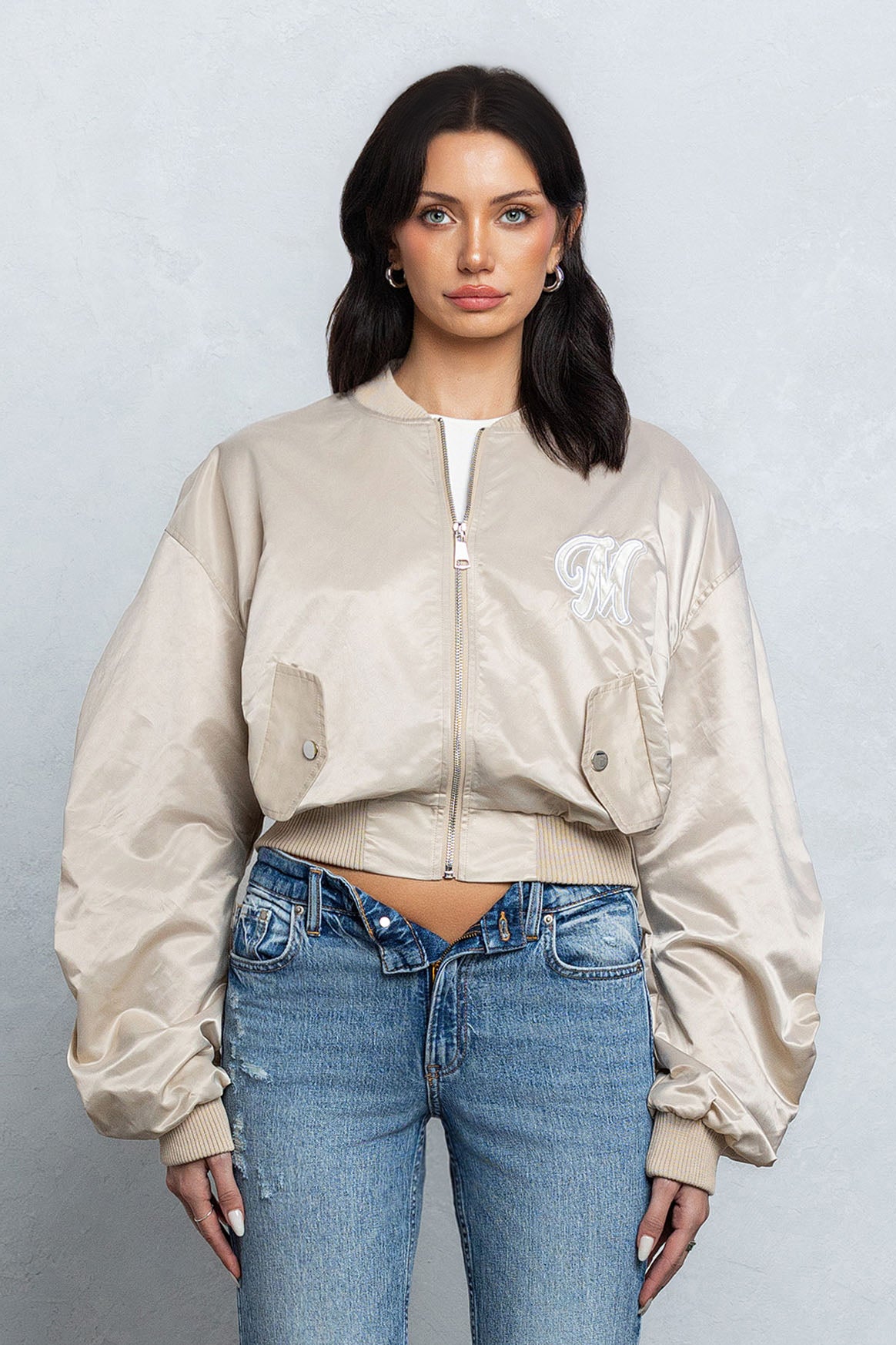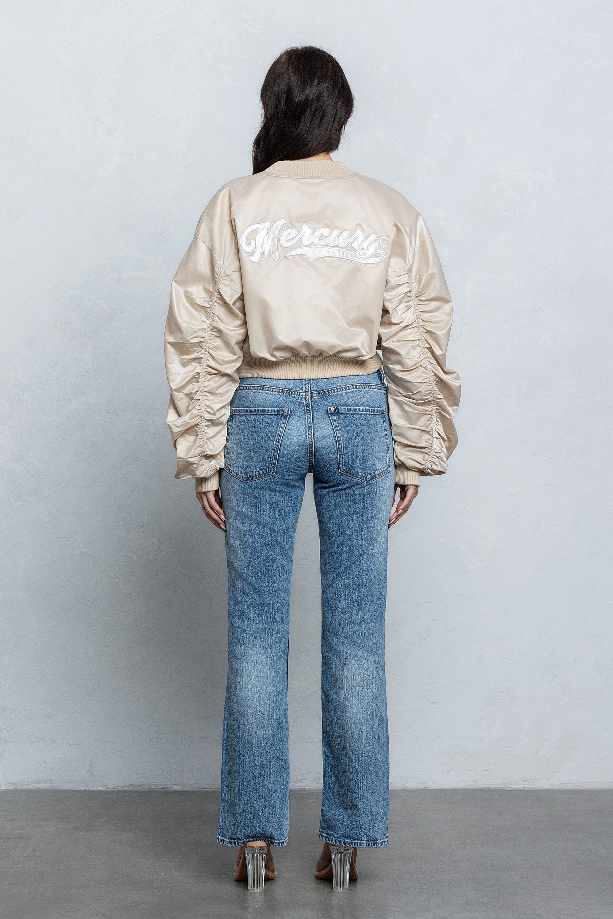The Mercury zip up bomber jacket is made from a satin effect nylon material with faux leather patch embroidery details. This jacket features an overall loose fit, cropped length and ruching on the sleeves. The patch is featured on the front and back of the jacket.