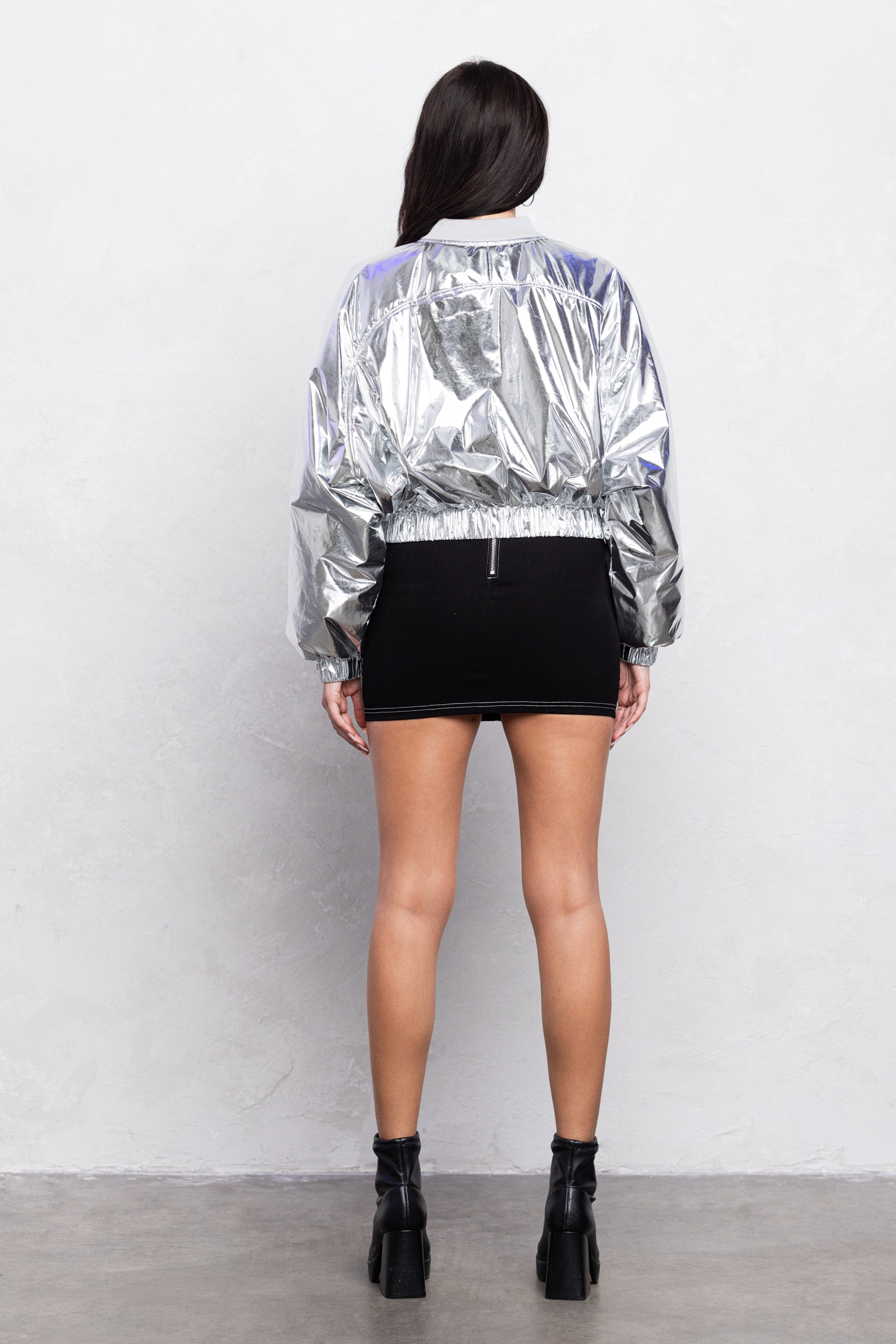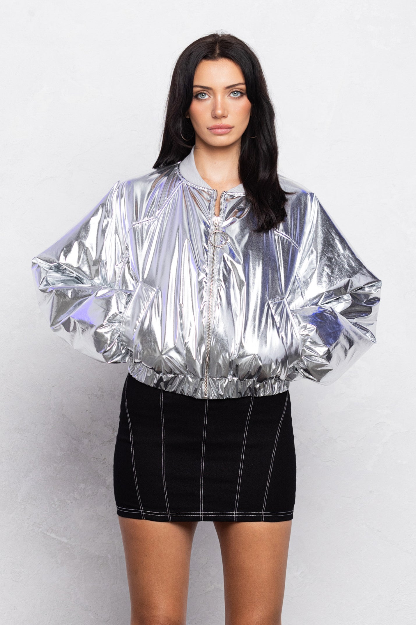 The Xia zip up bomber jacket is made from a metallic fabric filled with padding for a plush texture. This jacket features an o-ring zipper closure with a oversized fit and cropped length. The bottom opening is finished with an thick elastic band.