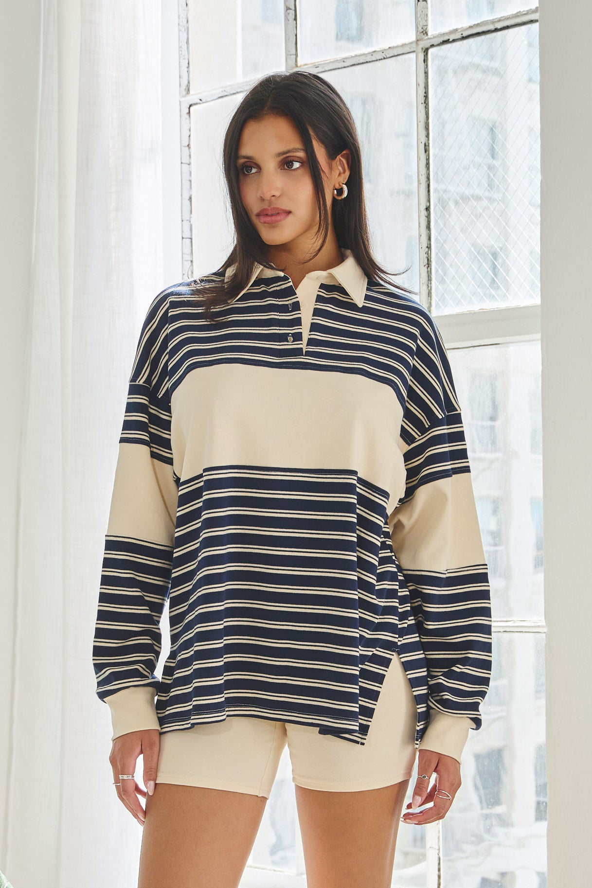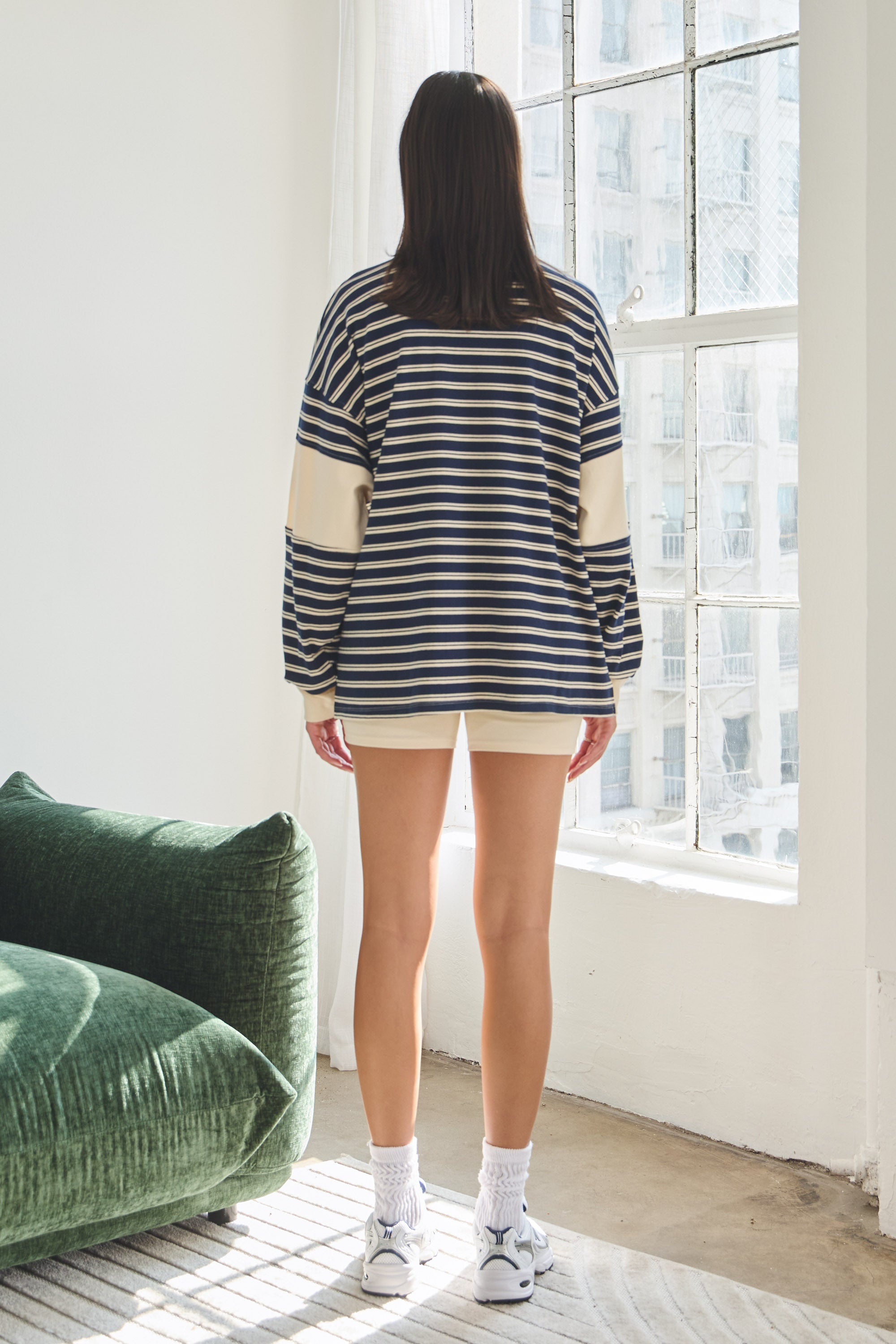 The Brooklyn Set includes an oversized double-stripe rugby top and cream biker shorts, both crafted from soft jersey for a comfortable, relaxed fit. The set features a casual silhouette with button-down detailing on the top for a subtle, stylish touch.