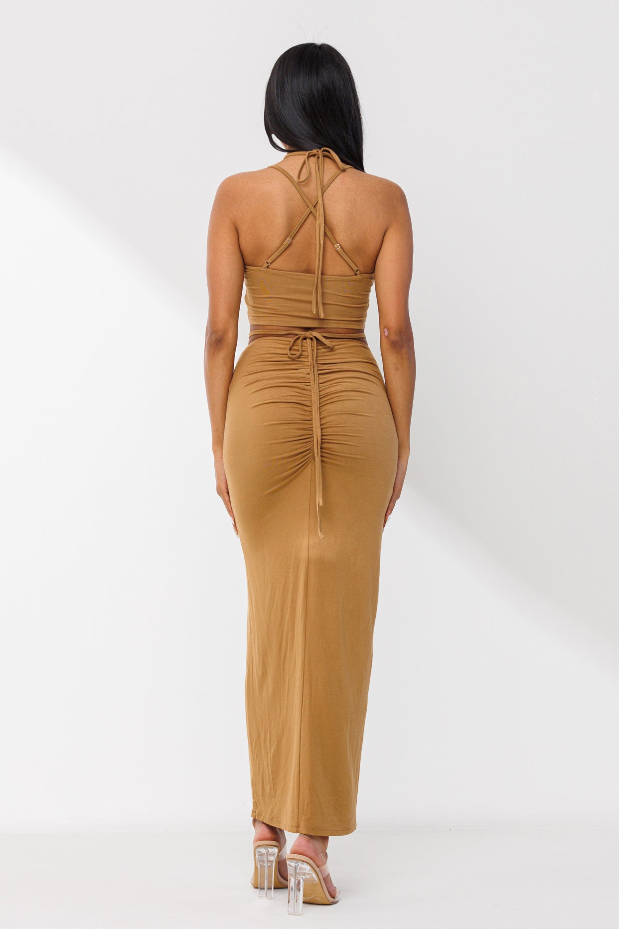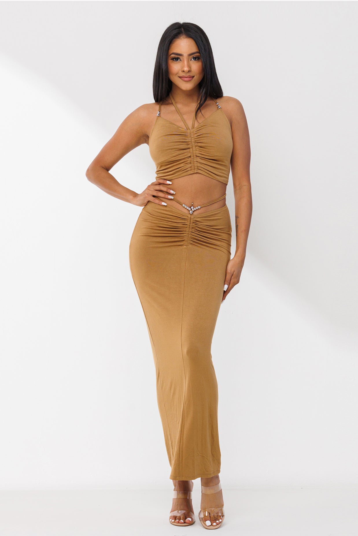 BRONZE SOFT JERSEY RUCHED CROP TOP MIDI SKIRT SET