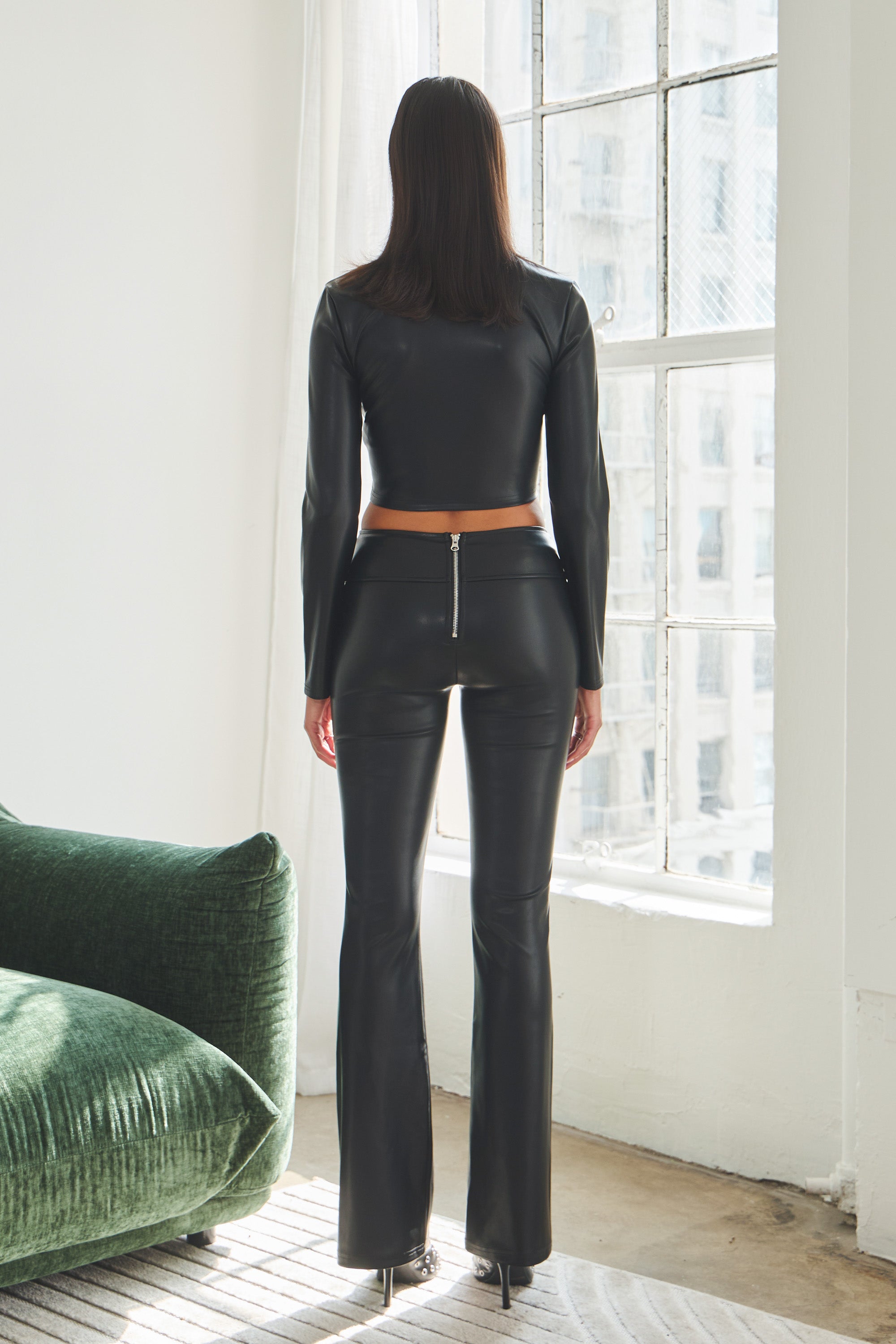 LEXY LEATHER V-CUT ZIP-UP MOCK NECK TOP - BLACK