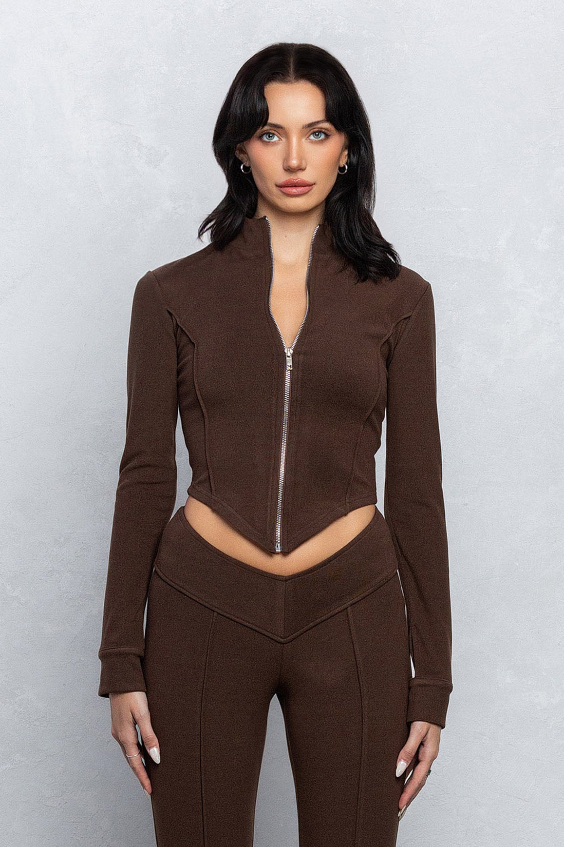 KIMI V-CUT ZIP-UP MOCK NECK TOP - CHOCOLATE