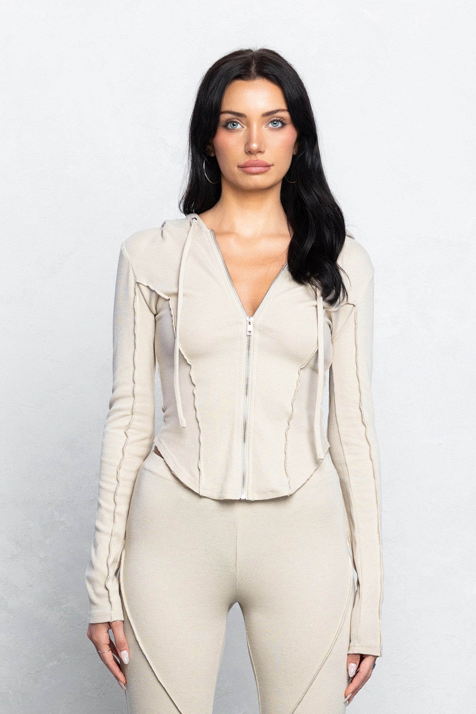 KIRA RIBBED ZIP-UP HOODED TOP - STONE BEIGE