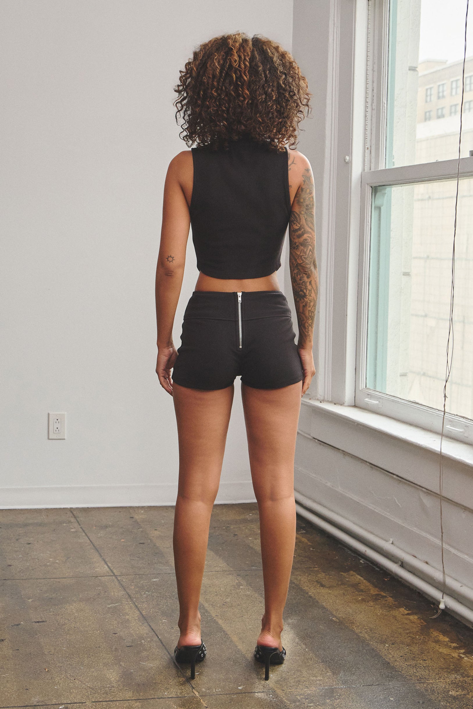 The Alma Sleeveless Zip-Up Top is made from ultra-soft, stretchy jersey that hugs your curves for a sleek, flattering fit. It features a distinctive V-cut waistline, cropped length, and a subtle mock neck for a modern, sculpted silhouette.