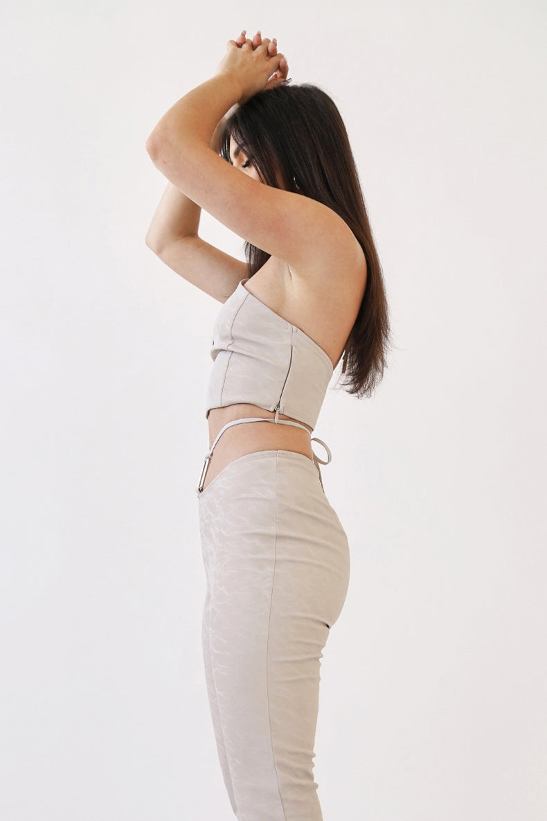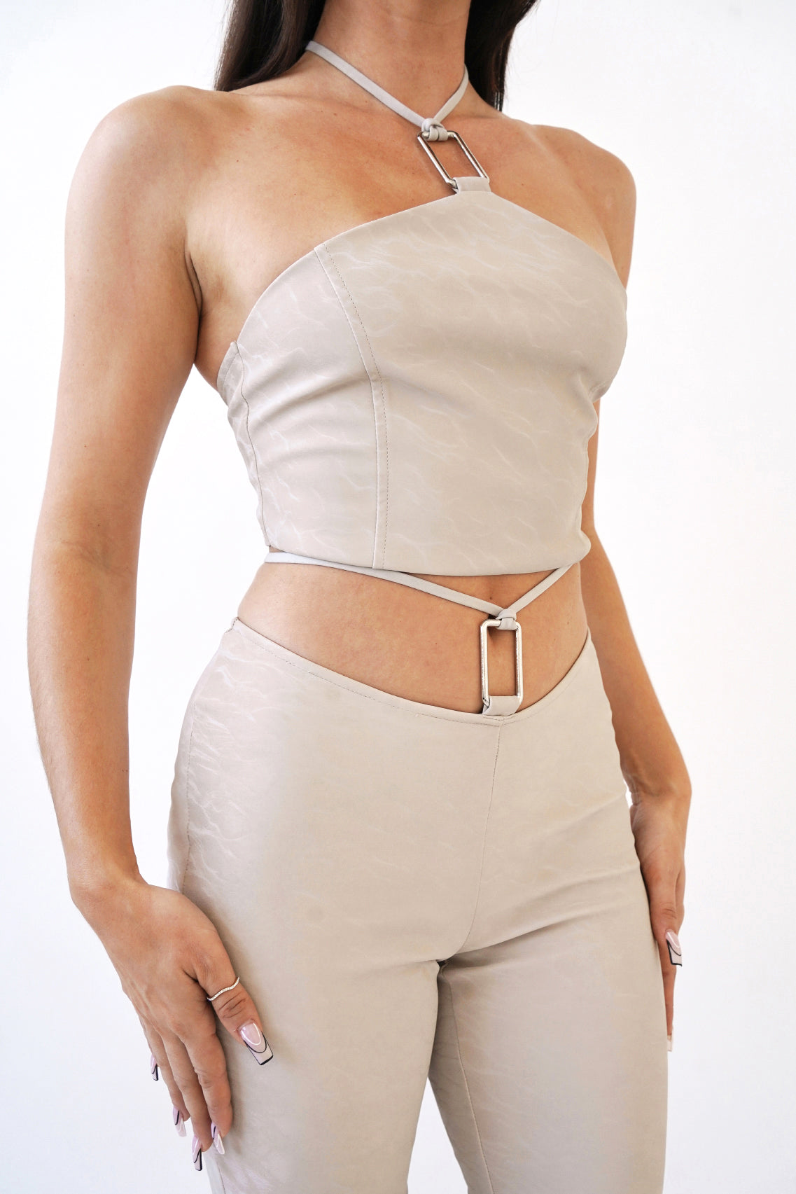 DOVE MATTE FAUX LEATHER SQUARE BUCKLE HALTER TOP