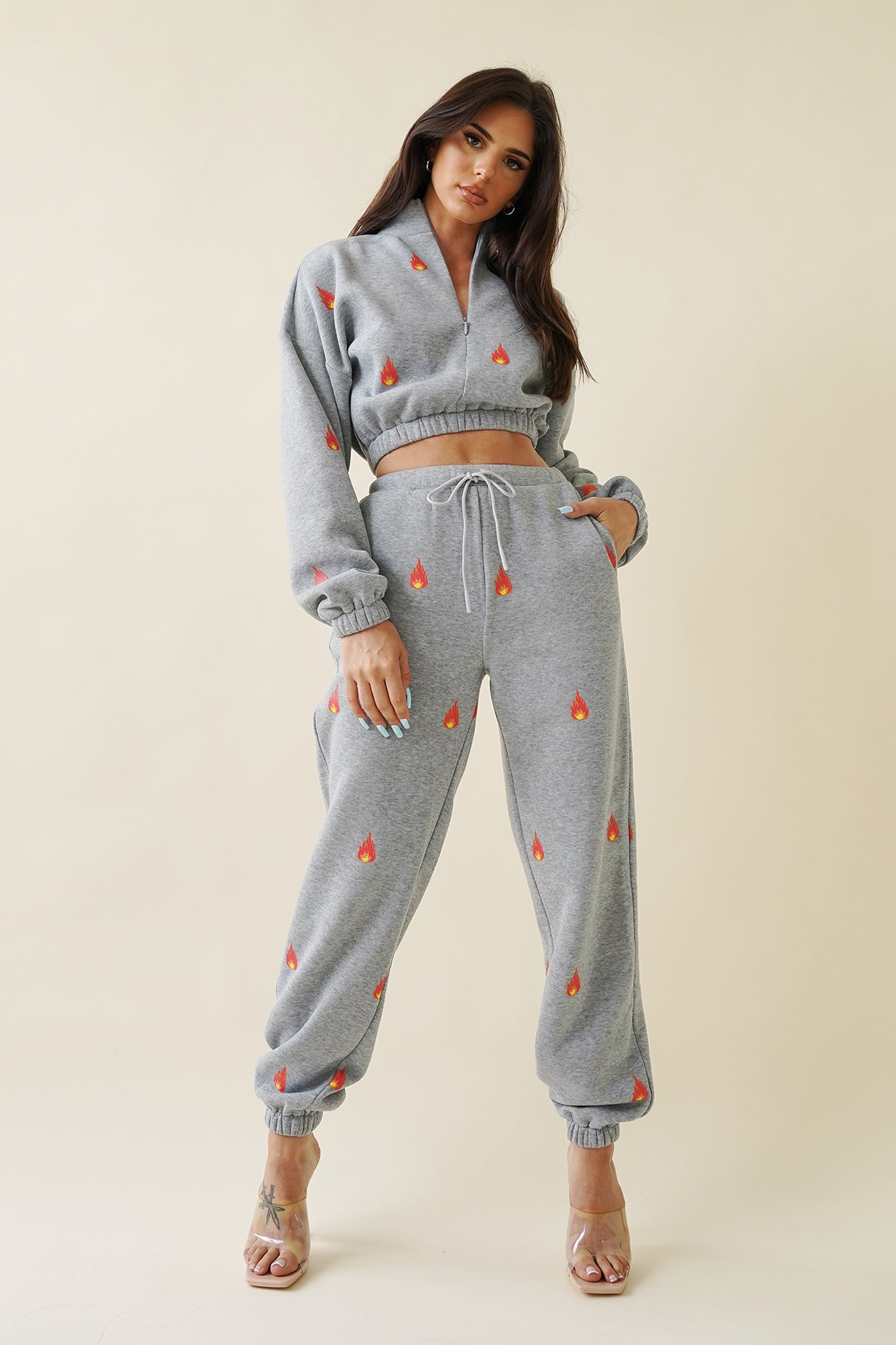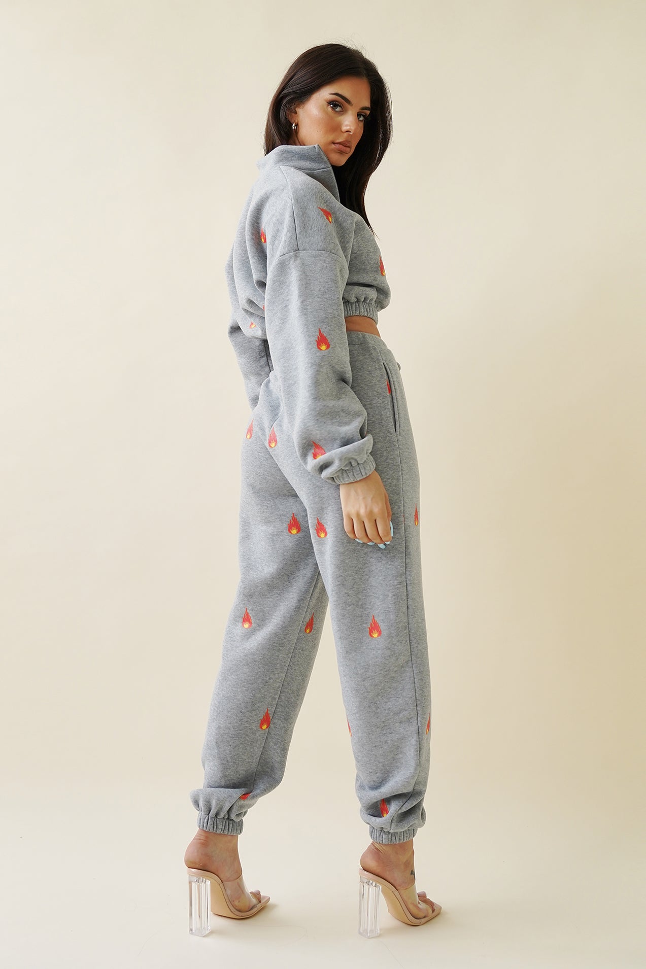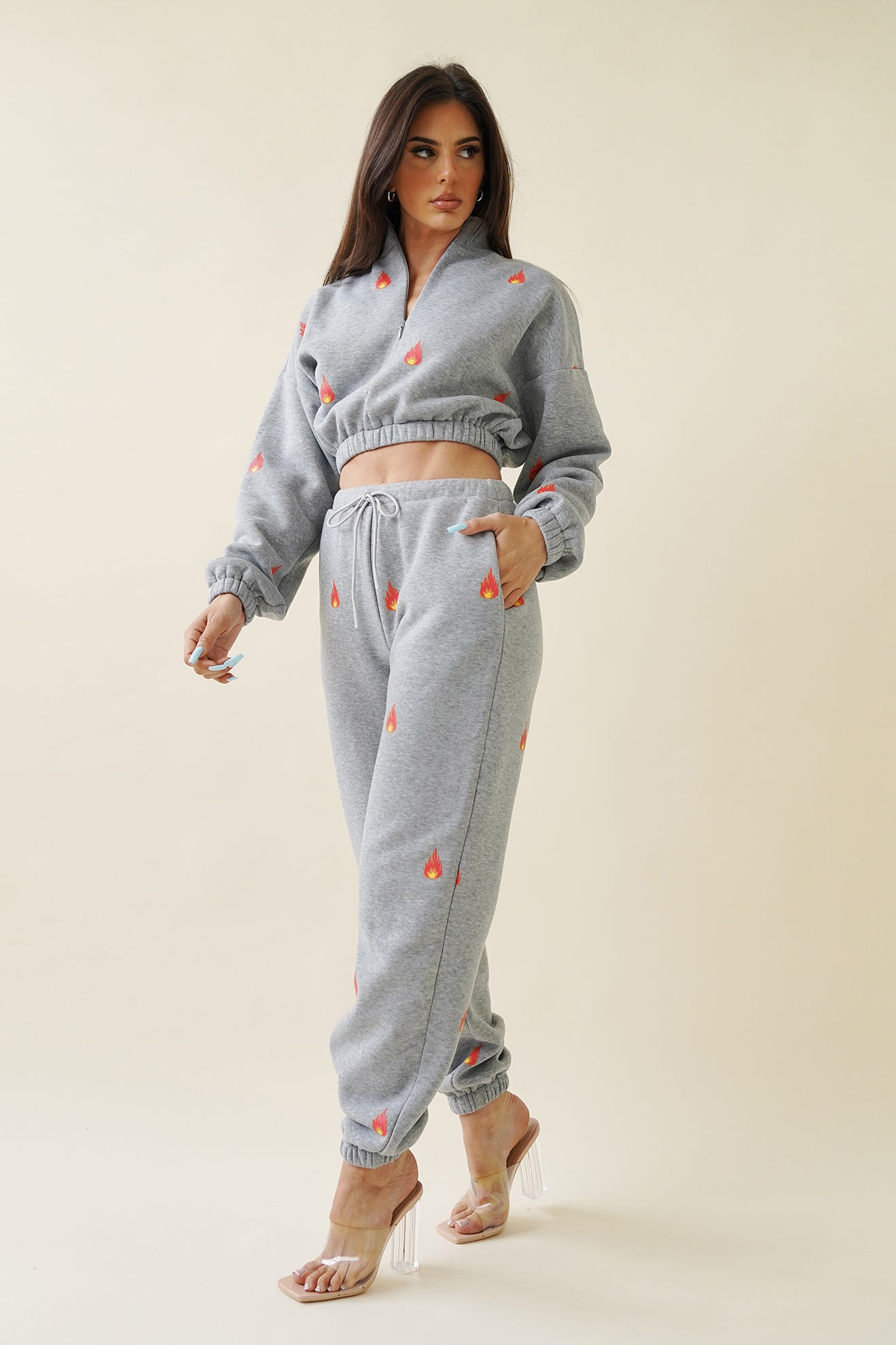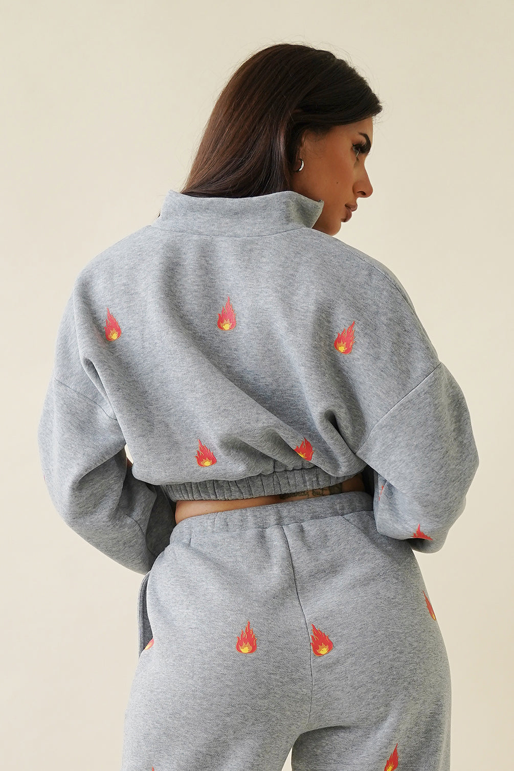 HEATHER GREY FLAME PRINTED FLEECE CROP SWEATSHIRT