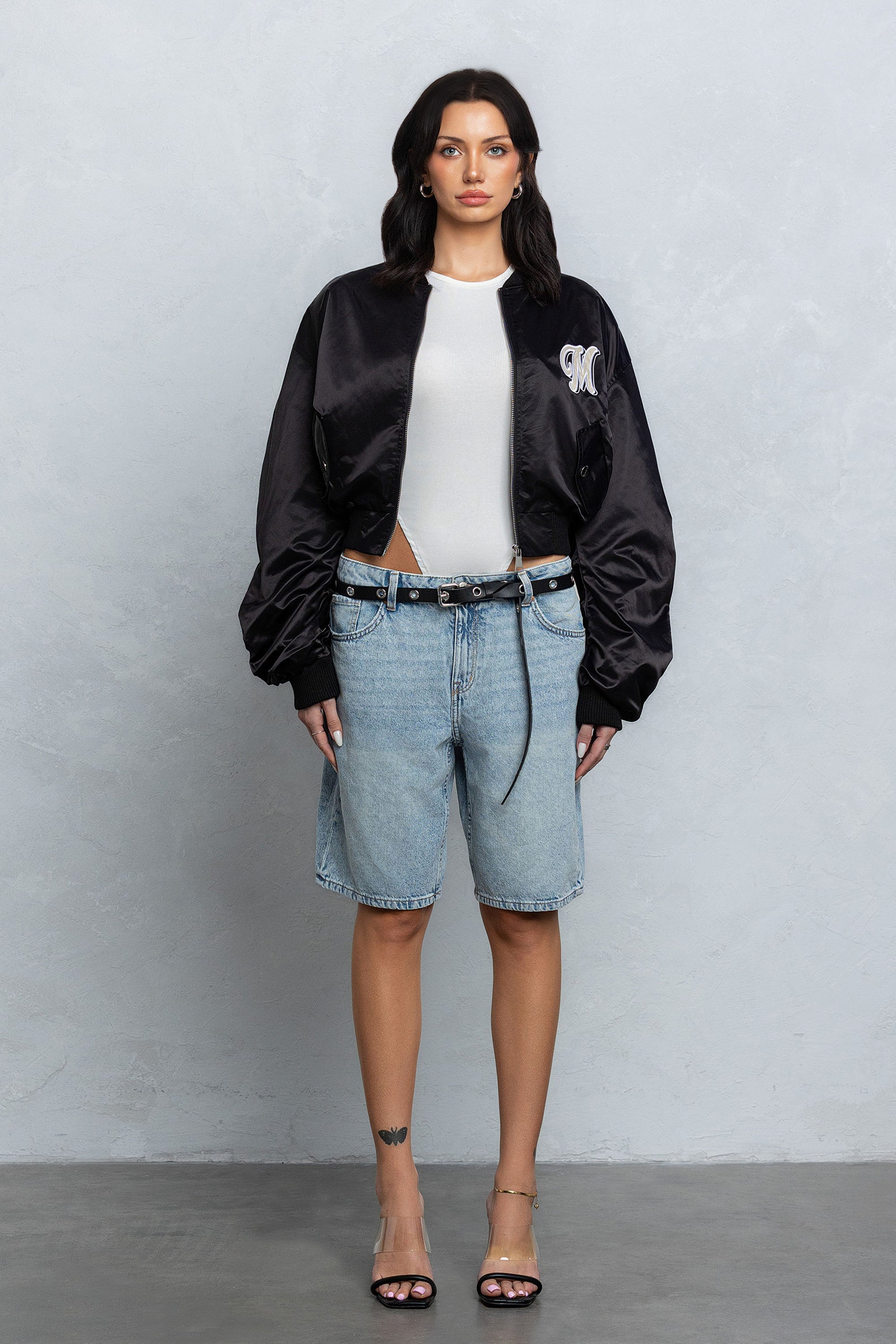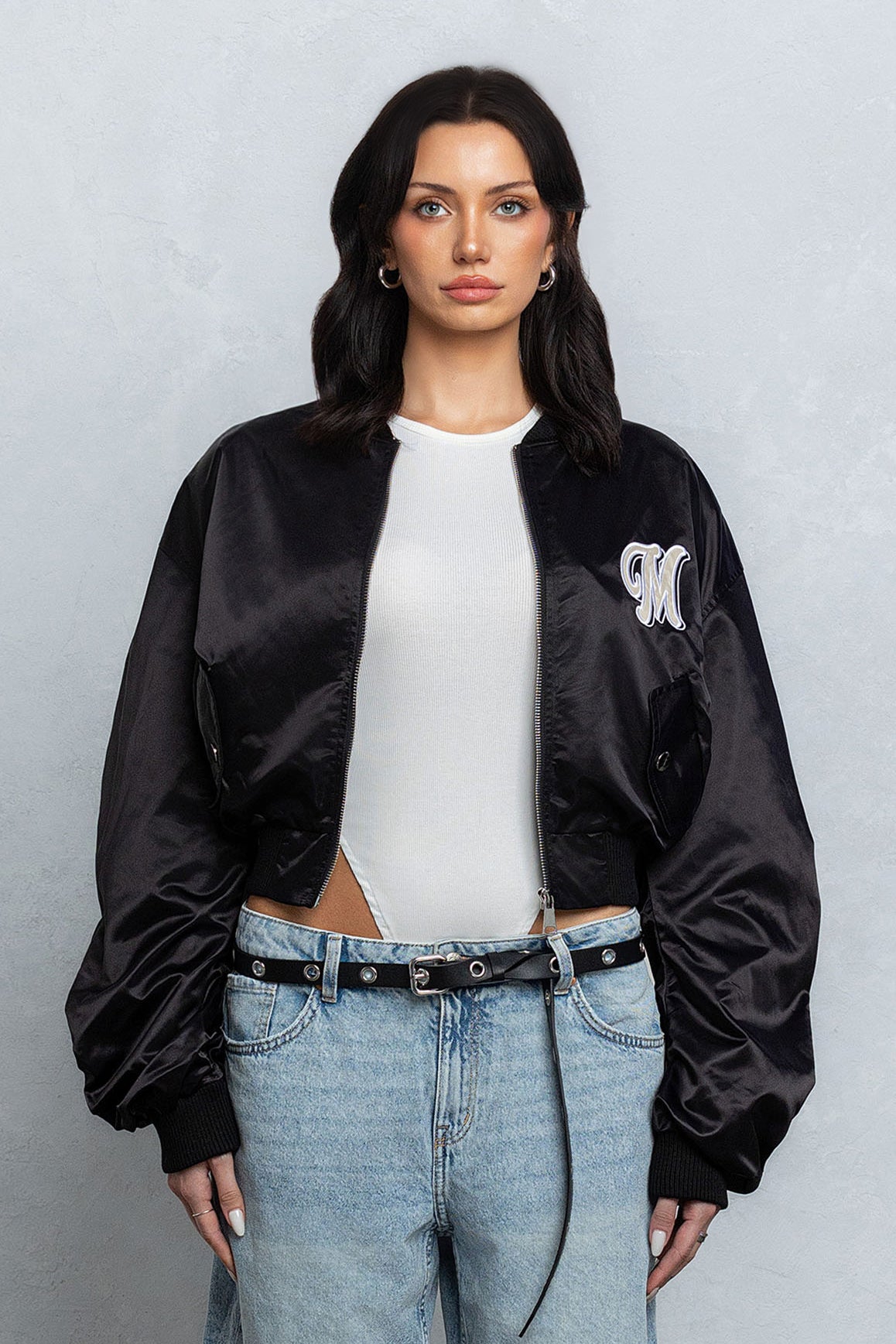 The Mercury zip up bomber jacket is made from a satin effect nylon material with faux leather patch embroidery details. This jacket features an overall loose fit, cropped length and ruching on the sleeves. The patch is featured on the front and back of the jacket.