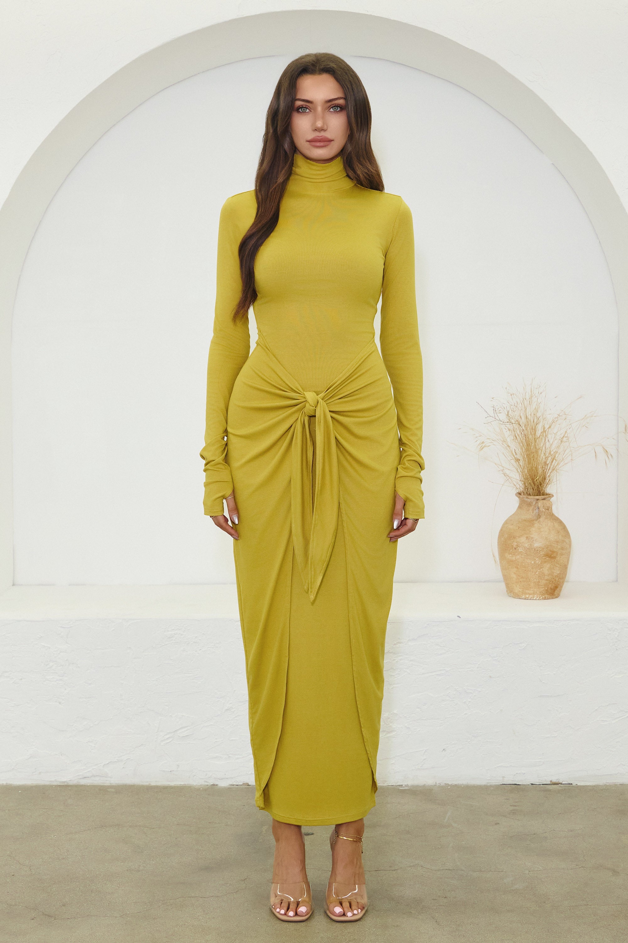 ROSALINE TURTLE NECK MAXI DRESS W/ KNOT TIE - MUSTARD